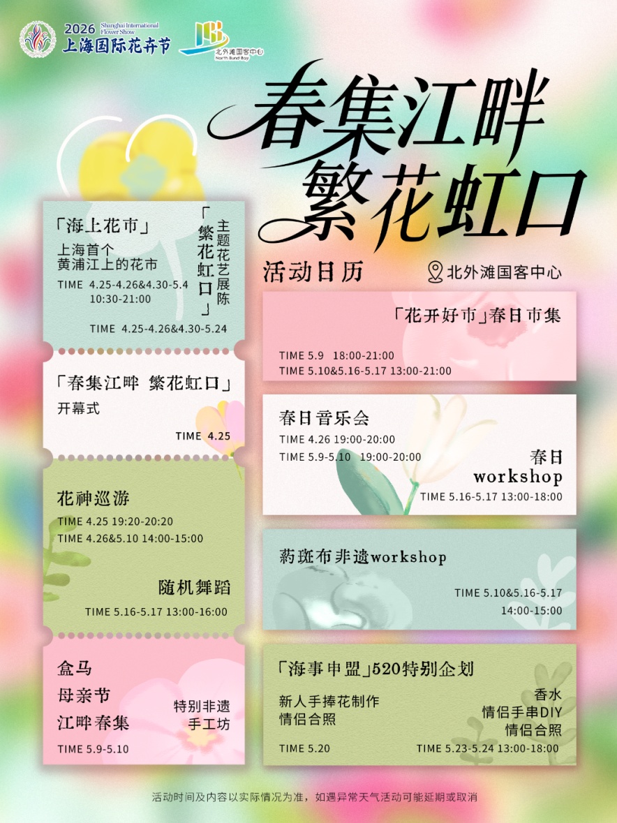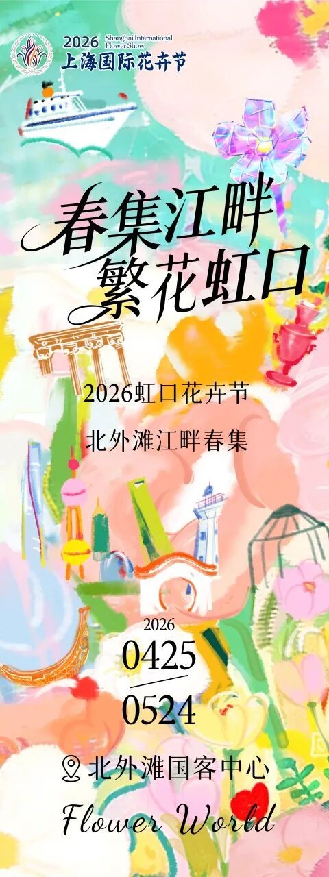 随着2026上海国际花卉节 拉开帷幕 4月25日至5月24日 “春集江畔、繁花虹口” 2026上海虹口花卉节 也将热力登陆 黄浦江上开花市 丝路繁花搬进江畔 花艺打卡点美到爆 还有母亲节簪花手作 520甜蜜彩蛋…… 浪漫续航整整30天! 在国客中心码头、太平路、廊桥 “小巨蛋”、海事塔、魔都画布 打造六大沉浸式花艺打卡点 以及 一条“一带一路花艺长廊” ↓↓↓