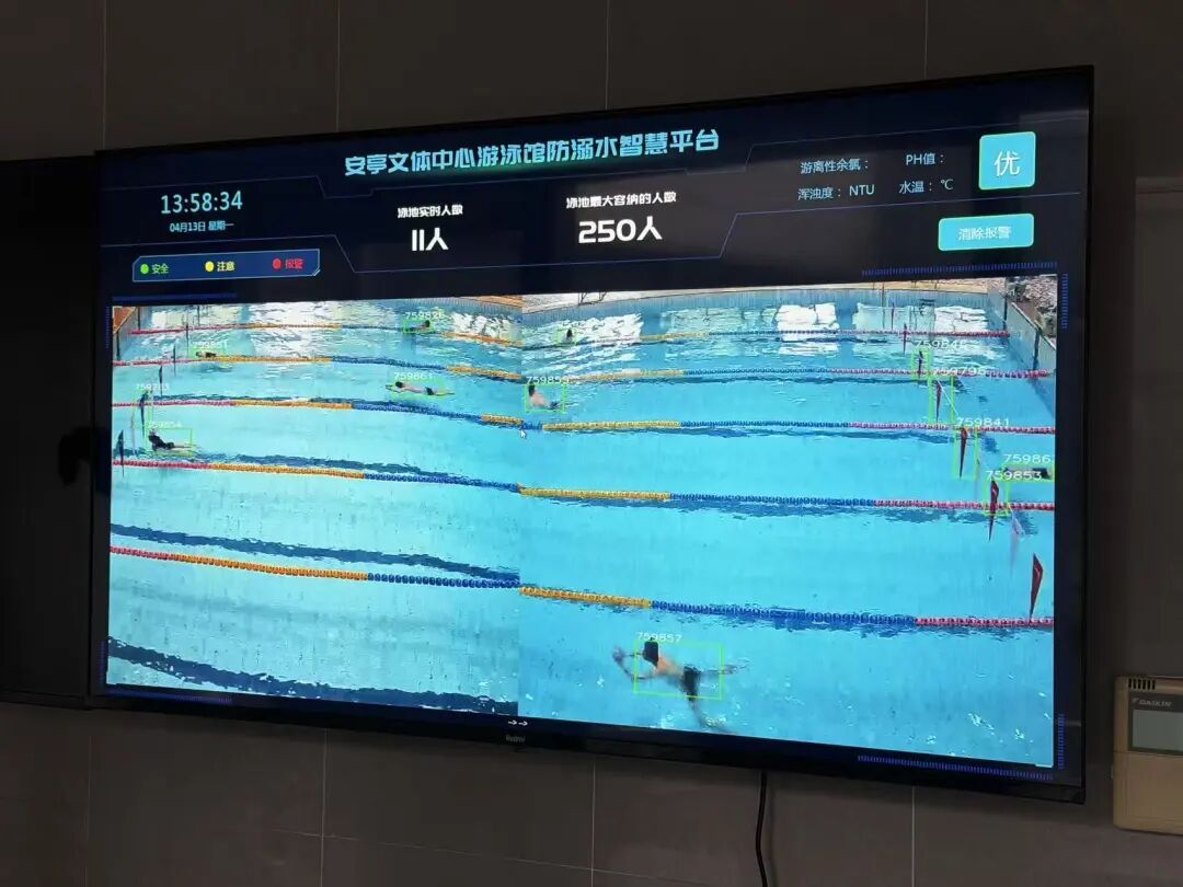 除了水环境的提升,安亭游泳馆此前运行的防溺水智慧平台系统,也将继续为泳客提供坚实的安全保障。叶澜锋介绍,该电子屏会实时捕捉每一位泳客的动作,如果系统识别到有人突然挣扎、长时间静止或者从水面消失,捕捉框就会变成红色,同时警报会推送到泳池边救生员佩戴的智能手表上,通过震动和红色文字提醒他们第一时间处理。泳池边常年配有3名定点救生员和1名巡视员,AED、救生担架等急救设备也都放在显眼易取的位置。