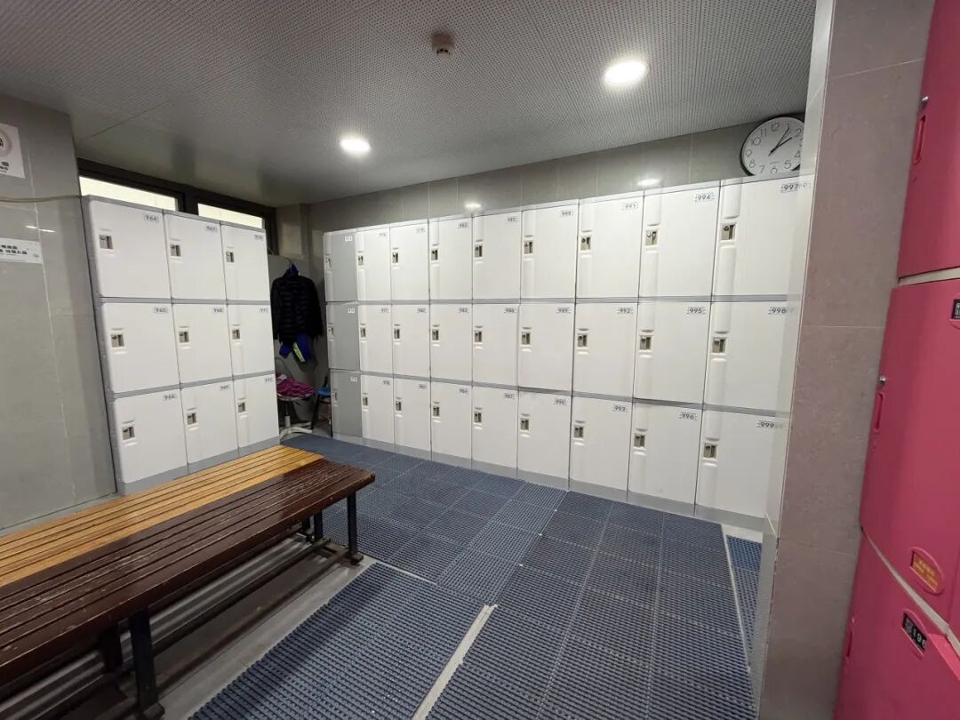 走进场馆内部,全新铺设的防滑地垫环绕泳池周围,脚感舒适;更衣室内,部分老旧的储物柜也已更换,空间利用率更高。