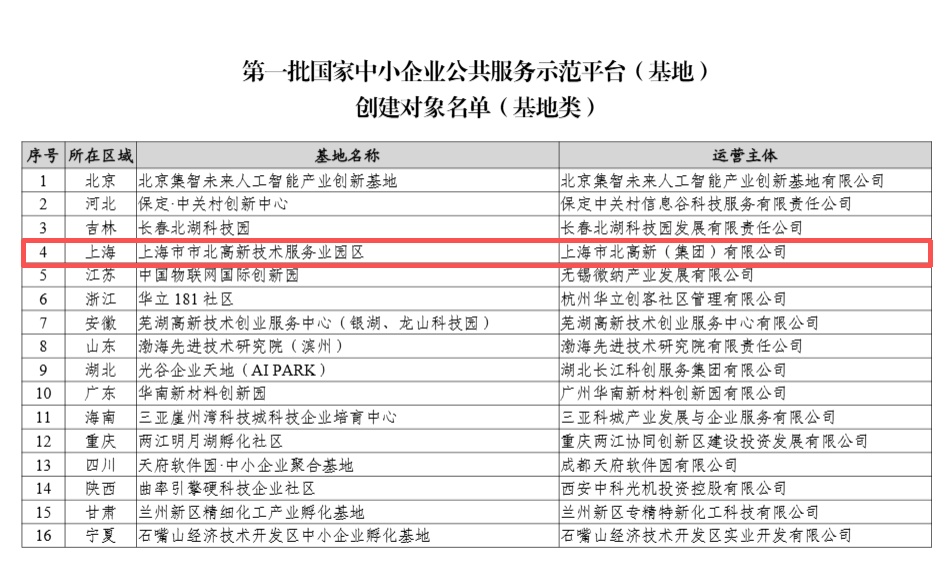 中小企业是国民经济和社会发展的生力军。为构建优质高效的中小企业公共服务体系,近日,工业和信息化部公示第一批国家中小企业公共服务示范平台(基地)创建对象名单,市北高新成功入选基地类创建对象。