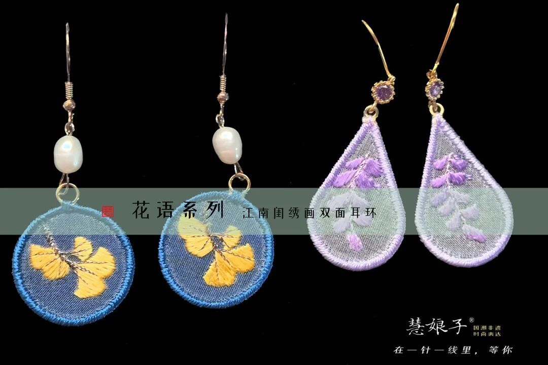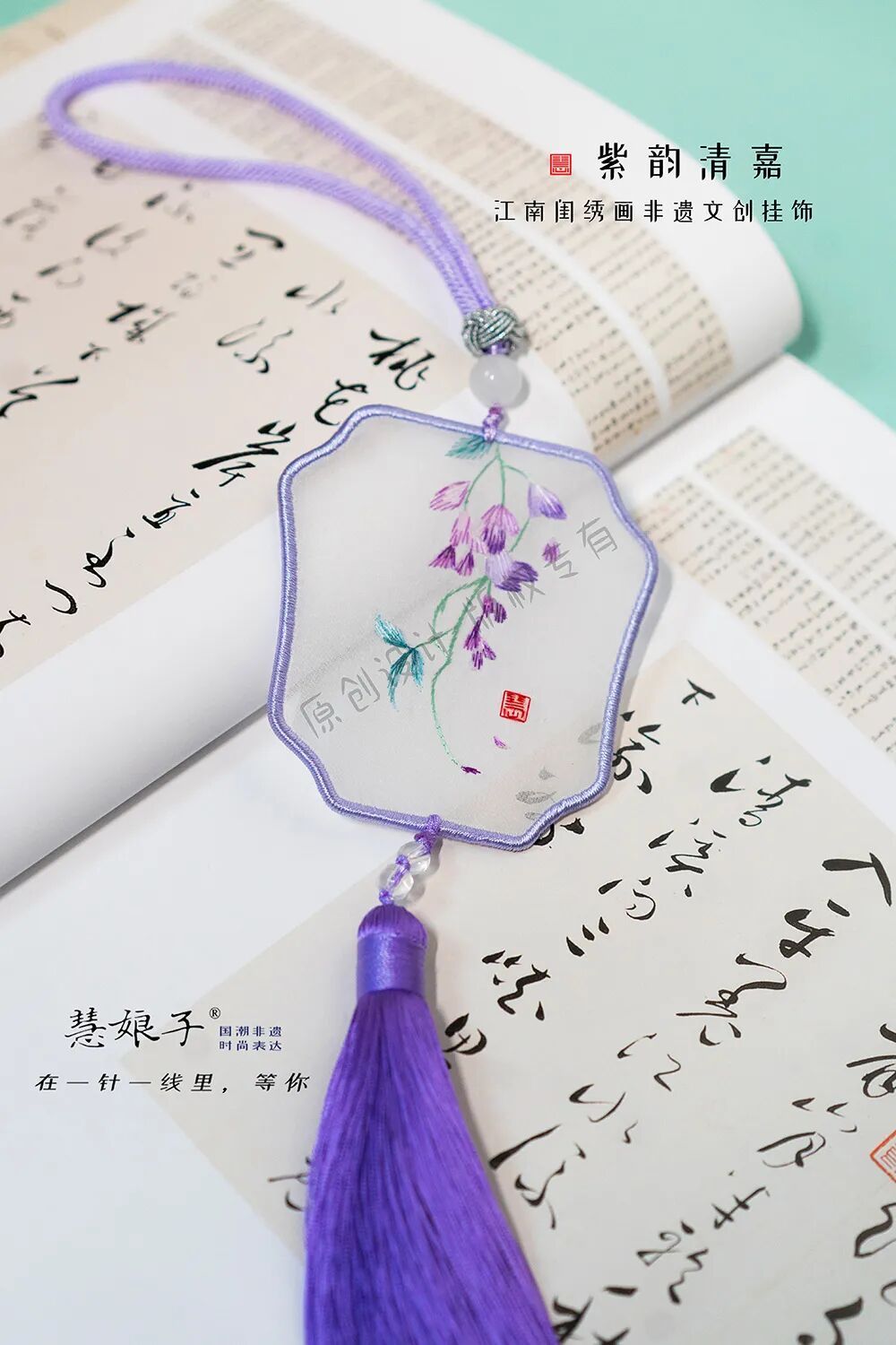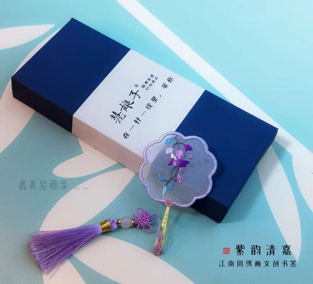 “紫韵清嘉”系列书签、挂饰选用紫藤花图案,配色清雅,以桑蚕丝线双面绣制而成,纯手工缠丝绕边,融入串珠、流苏等国风元素,小巧精致。该系列产品还曾获上海青少年创新成果展特等奖。