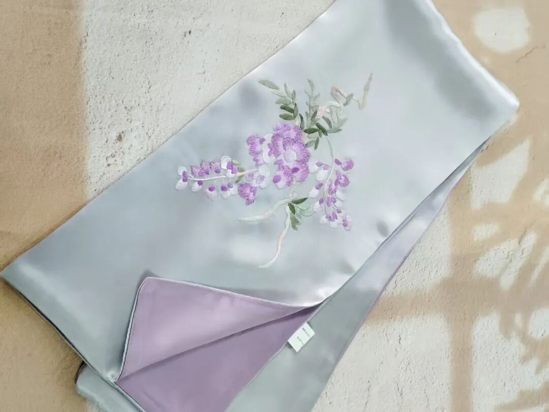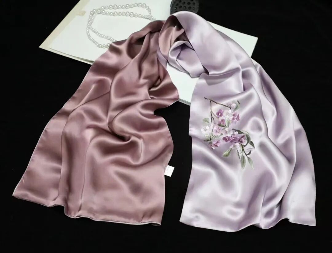 “苏绣紫藤花丝巾”将江南春色轻挽于颈间。绣娘将藤蔓缠绕、花穗垂坠的姿态用一针一线呈现出来,紫白相间的花瓣层层晕染,由深至浅过渡自然,仿佛能闻到淡淡花香。佩戴时,既有传统苏绣的精致典雅,又不失现代丝巾的实用百搭。