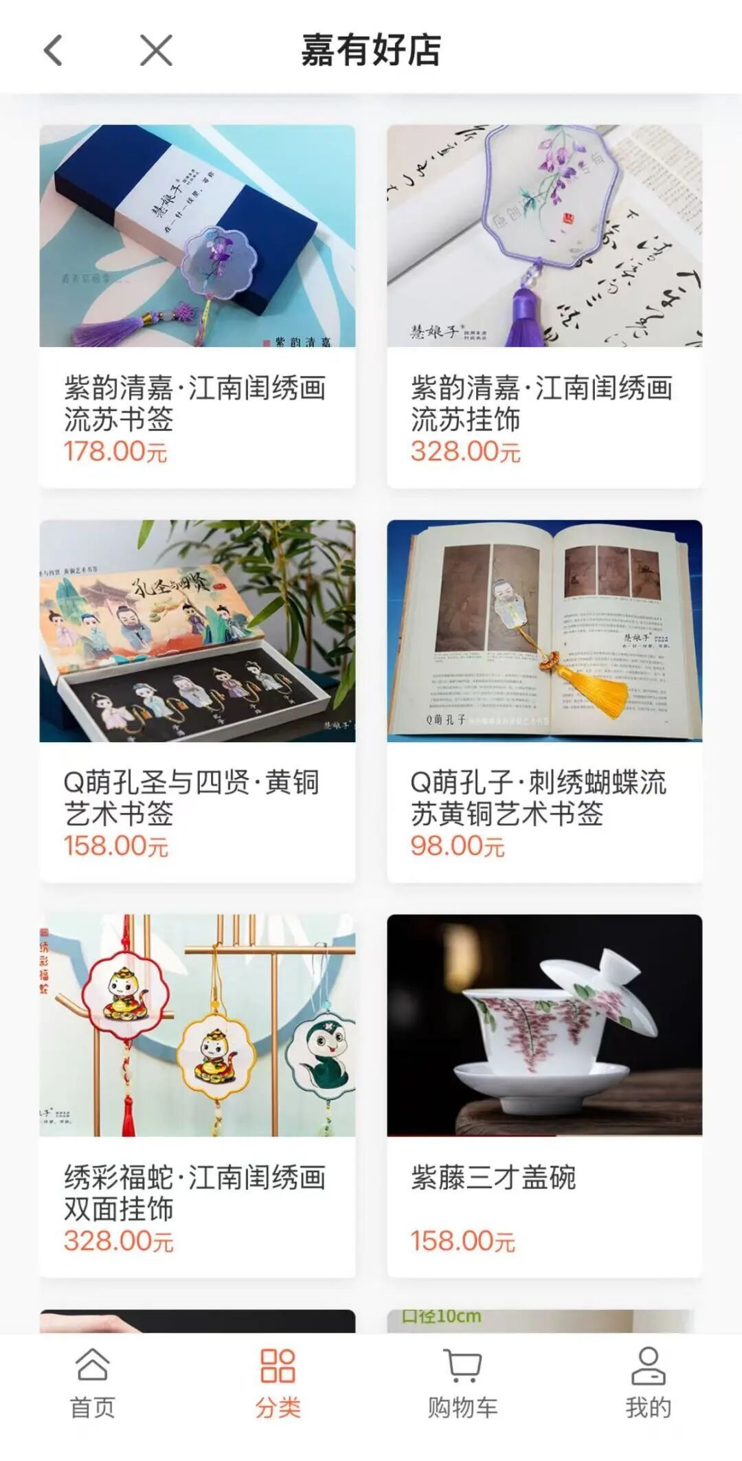 进入“嘉有好店”后,可下滑商品列表,找到“紫韵清嘉挂饰”“紫藤明信片”“紫藤西施壶”等紫藤系列产品,根据页面提示完成下单。(当然您也可以逛店铺选购其他心爱的非遗商品哦~)