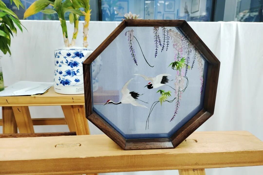 “紫藤瑞鹤八角屏风”以苏绣精工织就,将紫藤的婉约与瑞鹤的仙风绣入绢面。八角屏风造型稳固,视野开阔,放置于家中可增添诗意与祥瑞。
