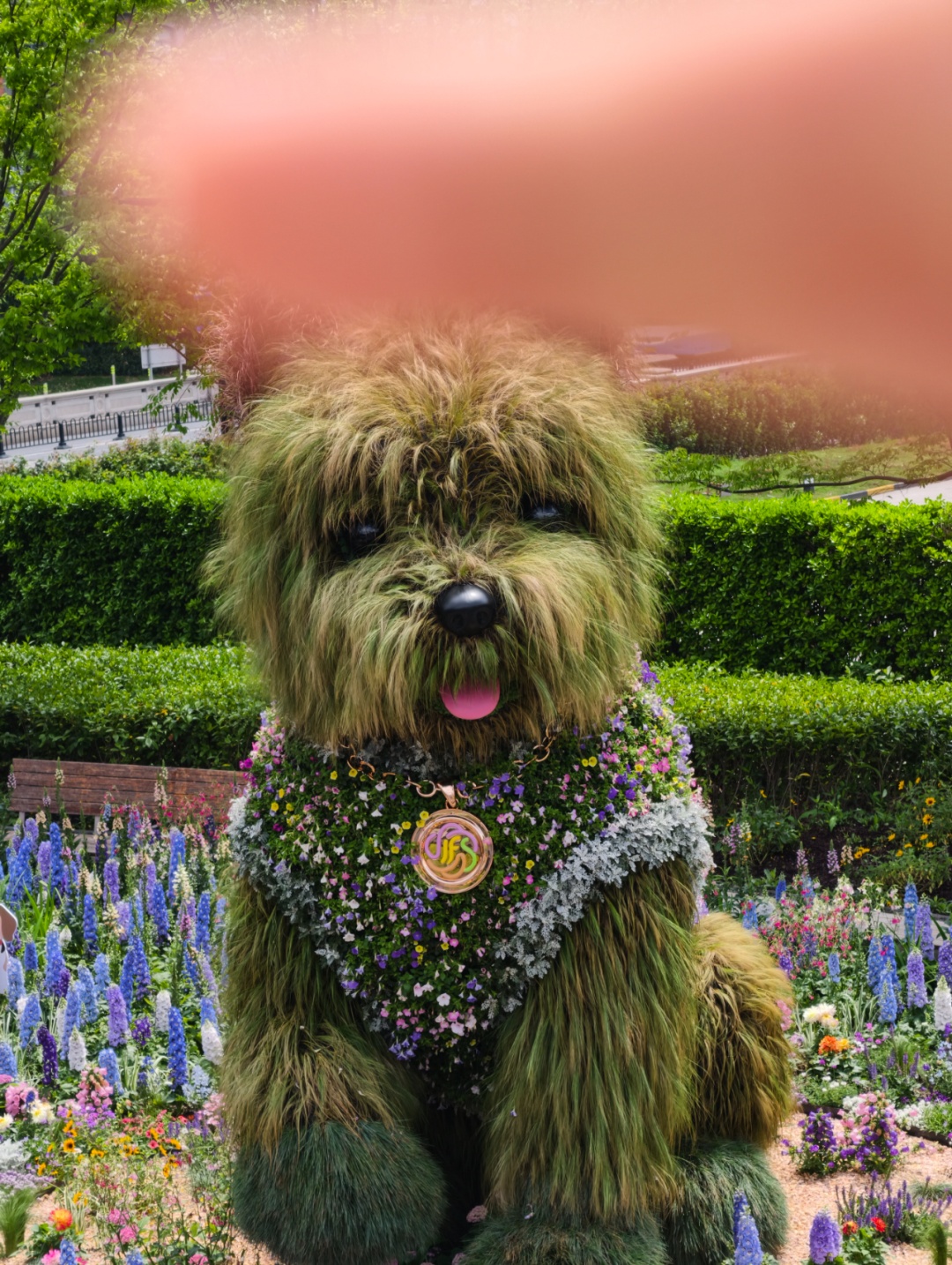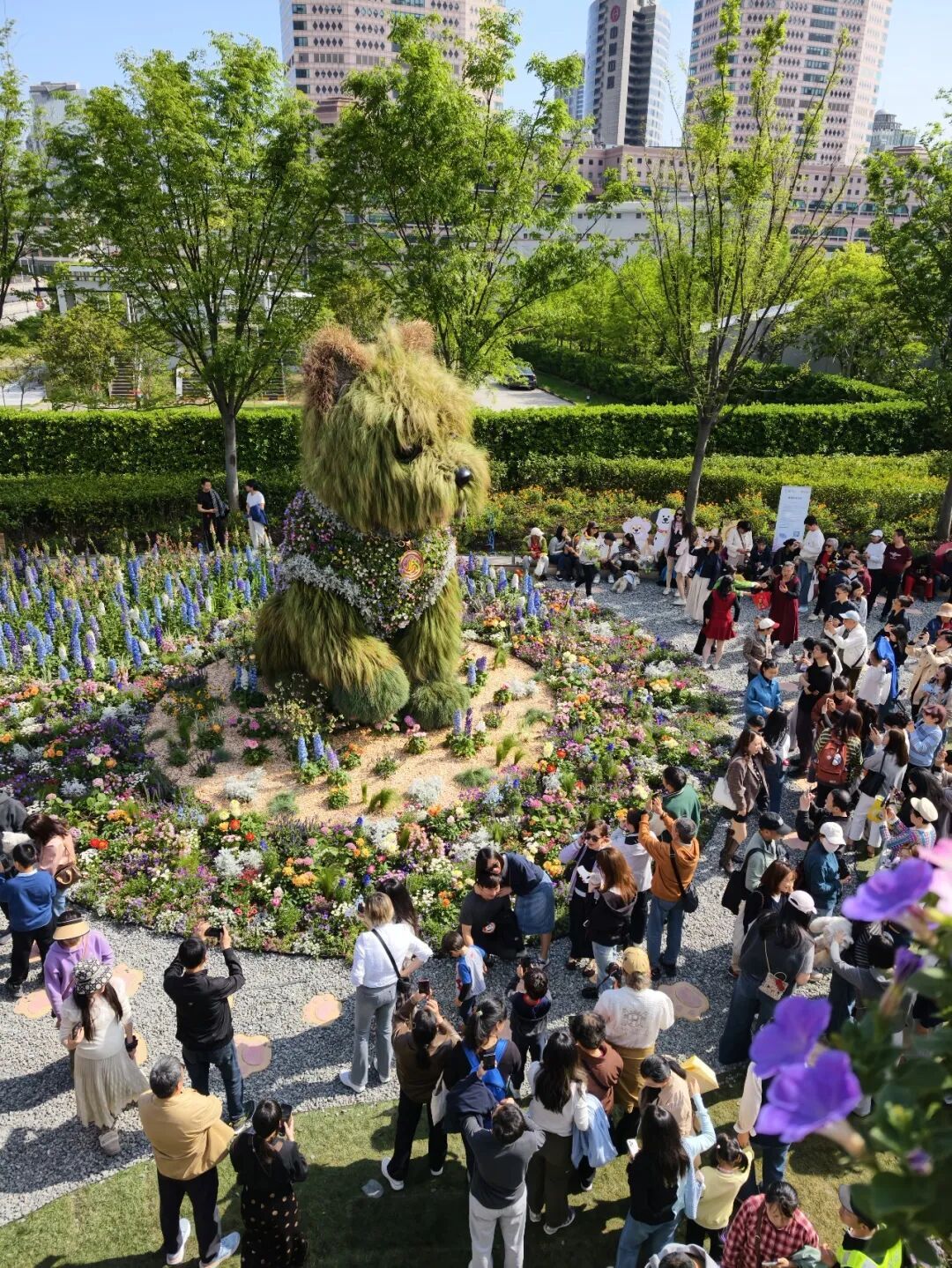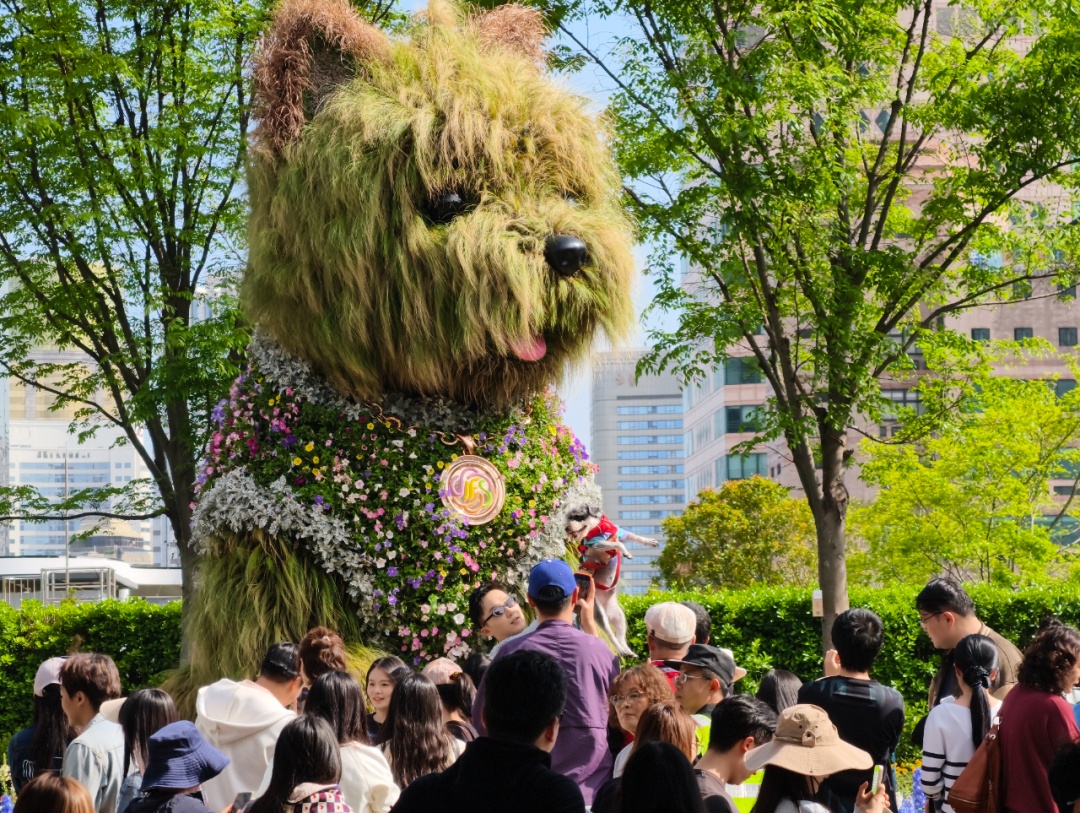 今天,连绵阴雨之后晴好天气终于返场,静安国际花卉展在首日就迎来大客流。记者在现场看到,主展区苏河湾中心绿地人头攒动,而人气最高的“顶流”,毫无疑问是那只高达5.2米的巨型西高地犬绿植雕塑——被网友亲切称为“潦草小狗”的它,用一身蓬松柔软的“真草皮毛”,萌翻全场。