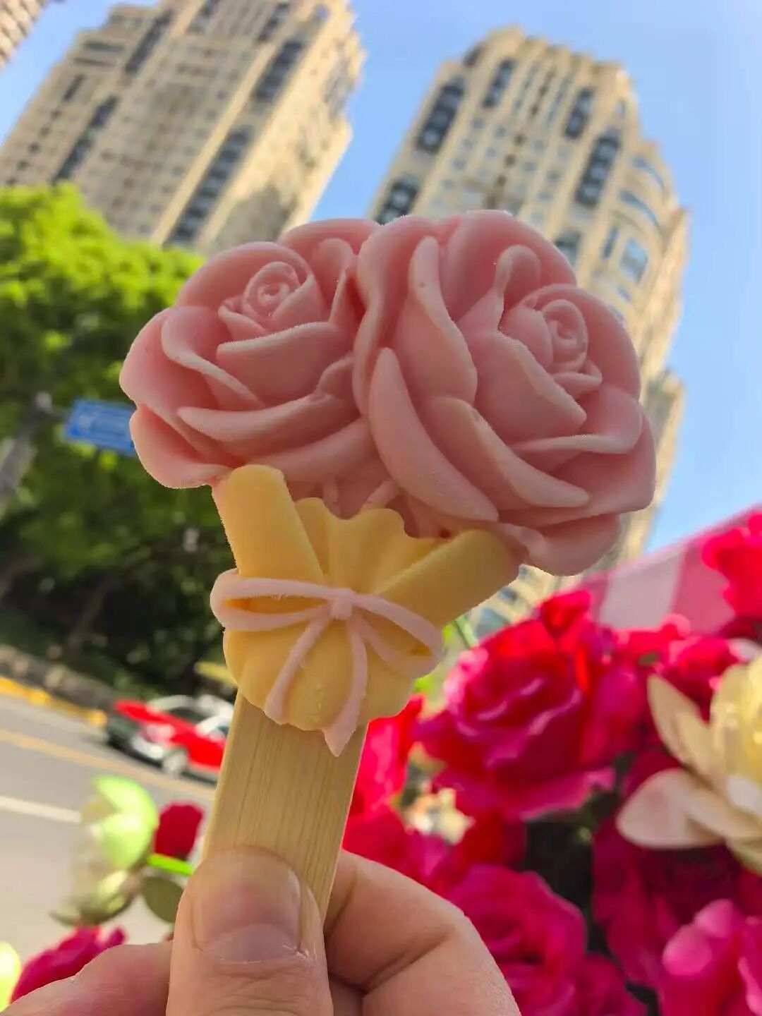 这三款冰淇淋分别是水蜜桃芒果牛奶口味、芒果海盐口味和草莓芒果口味。每款冰淇淋都以精美的花卉造型呈现,令人赏心悦目。水蜜桃芒果牛奶口味冰淇淋以粉色和白色玫瑰花为造型,甜美的水蜜桃与浓郁的芒果牛奶完美结合,带来一丝清新的夏日气息;芒果海盐口味冰淇淋则以浅蓝色的外滩海关大楼和金牛为造型,独特的海盐风味与芒果的香甜相互融合,口感层次丰富;草莓芒果口味冰淇淋以粉色玫瑰花为造型,草莓与芒果的酸甜搭配,更是让人回味无穷。