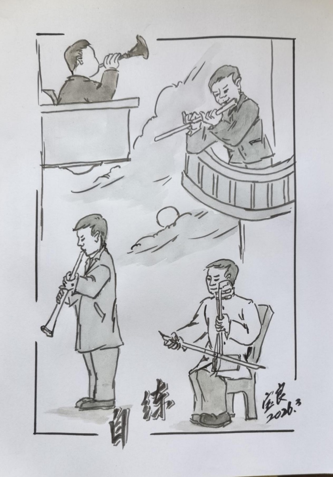 我到外面兜了一圈回来,只见自家三层楼上的小阿毛在吹唢呐,一阵阵高亢的声音冲上云霄。路过的人会禁不住循声看去,而邻居们都熟悉了。小阿毛从小随爷爷他们来自东北。他是听着唢呐长大的,这支唢呐是爷爷留下的,自从爷爷去世后,他怀念爷爷便自学吹唢呐。不知是他听惯了呢,还是爷爷的阴魂庇荫,不仅学得快,还吹得特好。现在他和小爷叔是民乐团的同事了。