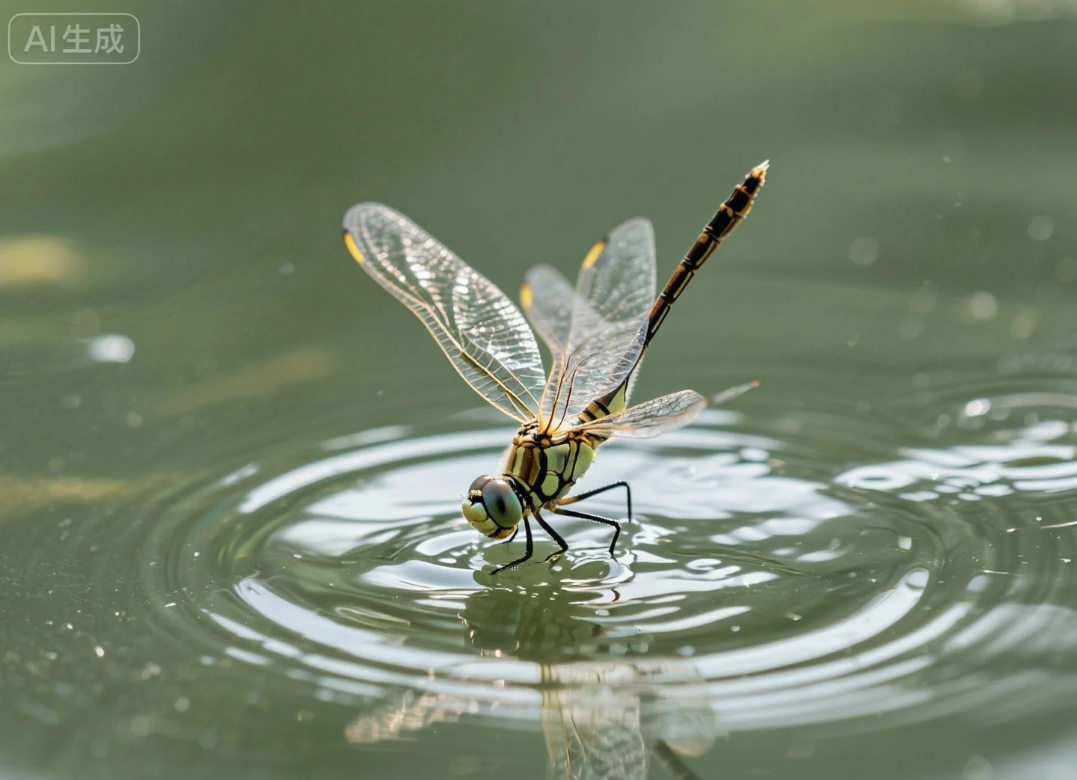 蜻蜓喜欢在水面上飞行,有时会用尾部轻触水面,这个动作就是我们常说的“蜻蜓点水”。其实这是雌蜻蜓在产卵,雌蜻蜓通常会选择在水中或水草上产卵来繁殖后代,这些卵孵化后就会变成幼虫,我们叫它水虿(chài)。