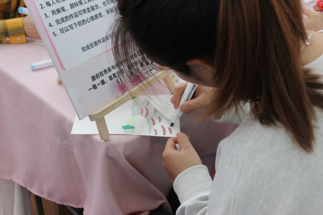 “曼陀罗疗愈工坊”里,同学们专注地为线稿涂色,色彩在笔尖流淌,烦恼在静心中慢慢消散;“音乐祝福留声站”则有人点播喜欢的歌曲,有人伏案书写贺卡,还有人对着二维码轻声录下祝福语音,以色彩、图形与音乐为媒介,同学们在“以美润心”中获得情绪安顿。