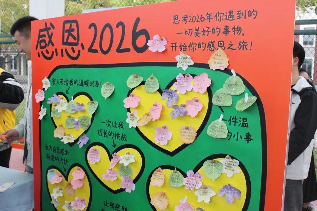 在“OH卡生命之旅体验站”,同学们围坐在一起,抽卡、续写、传递,一个又一个意想不到的故事在集体共创中悄然生长;“感恩树下·同行有光站”的立体树装置上,贴满了叶片形便利贴,“感谢给我让座的同学”、“感谢每一个看出我的尴尬、无助而主动向我提供帮助的人”……温暖的话语在笔尖流淌,同学们通过故事接龙与感恩书写,在共情表达中体验“以德育心”的力量。