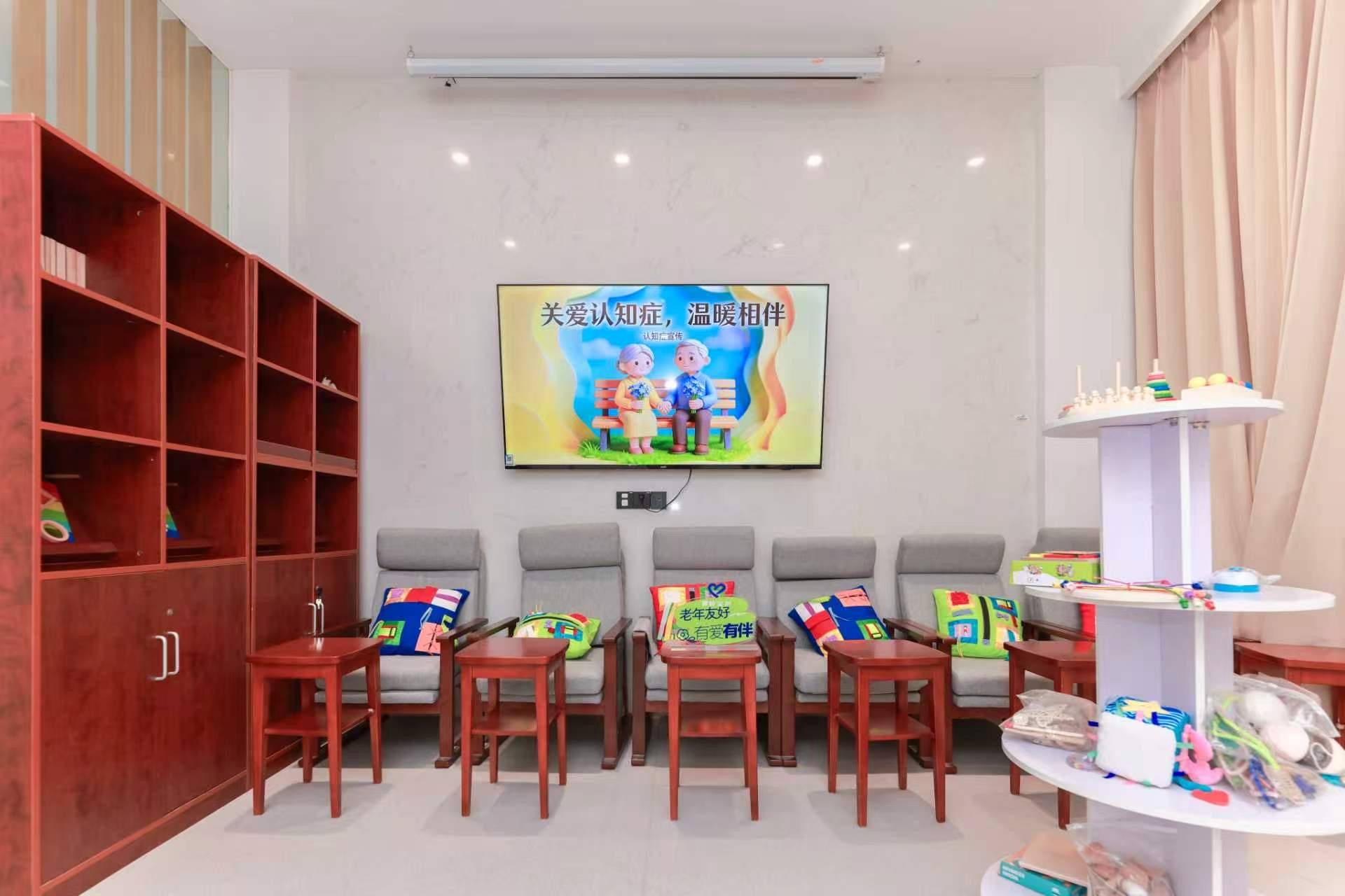 综合赋能区:以开放式图书馆为基底,藏书涵盖认知科学、照护实务等领域,桌椅自由组合适配多元场景;定期链接医社法等专业力量开展分层科普,让认知友好理念内化为社区共识。