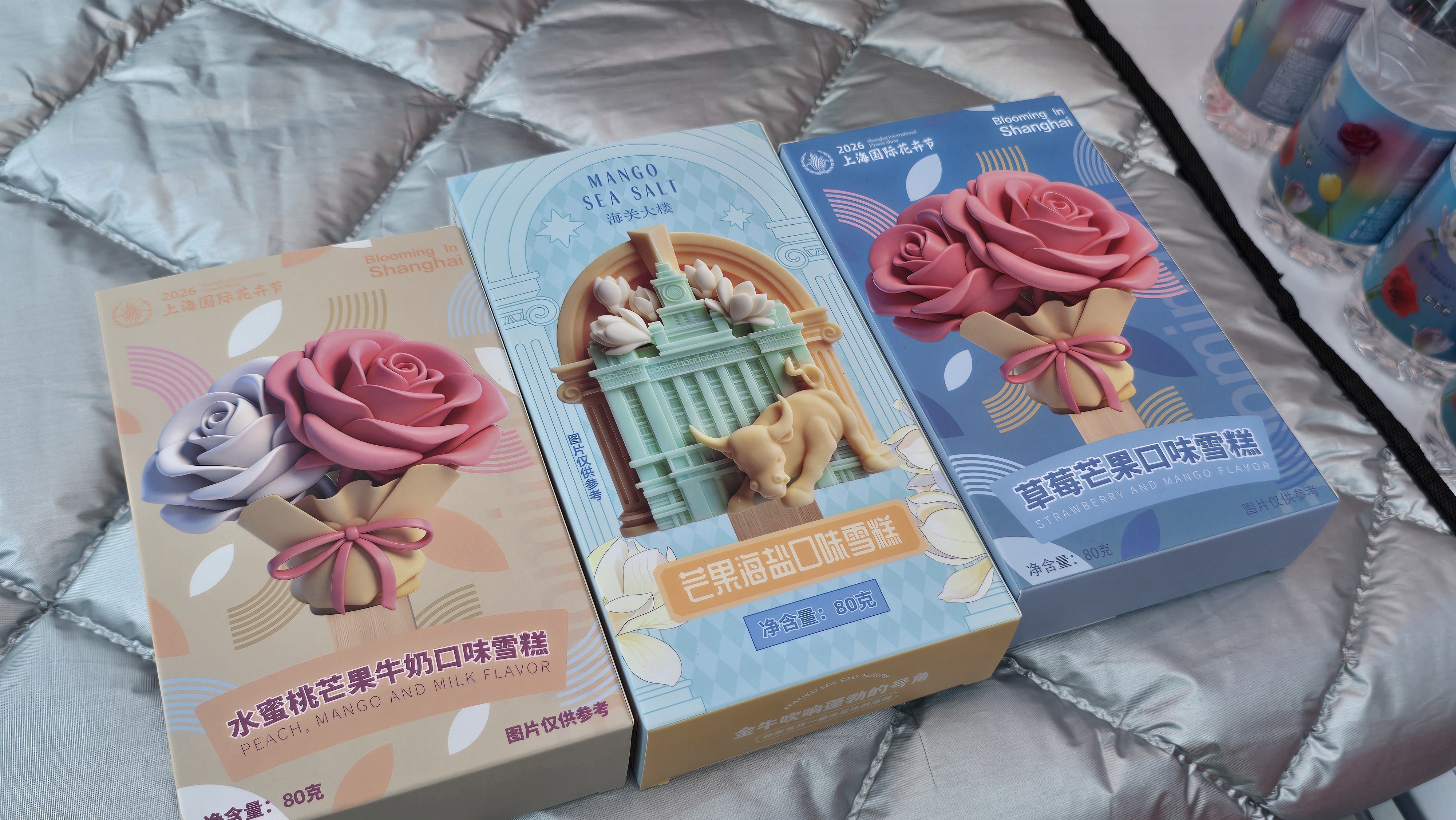 这三款冰淇淋分别是水蜜桃芒果牛奶口味、芒果海盐口味和草莓芒果口味。每款冰淇淋都以精美的花卉造型呈现,令人赏心悦目。水蜜桃芒果牛奶口味冰淇淋以粉色和白色玫瑰花为造型,甜美的水蜜桃与浓郁的芒果牛奶完美结合,带来一丝清新的夏日气息;芒果海盐口味冰淇淋则以浅蓝色的外滩海关大楼和金牛为造型,独特的海盐风味与芒果的香甜相互融合,口感层次丰富;草莓芒果口味冰淇淋以粉色玫瑰花为造型,草莓与芒果的酸甜搭配,更是让人回味无穷。