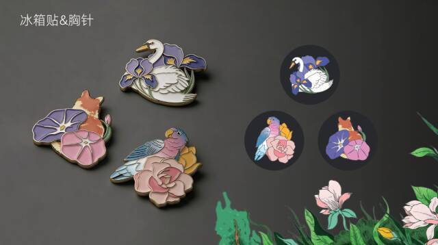 磁吸胸针3款,提取3幅插画中核心元素各一,花卉与动物巧妙组合,可爱养眼,轻松点亮穿搭细节。