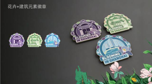花卉+建筑元素徽章,提取了3幅插画中的核心建筑与花卉元素,将海派风情浓缩于方寸之间,质感十足。