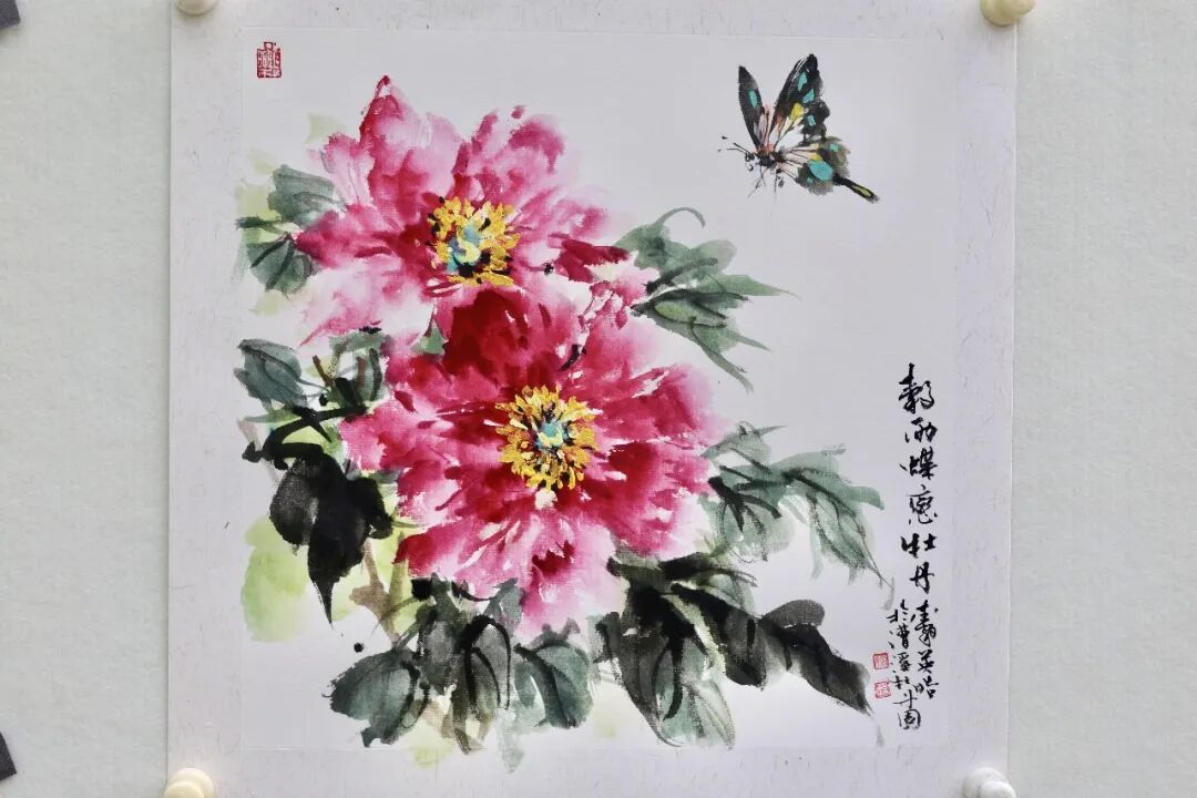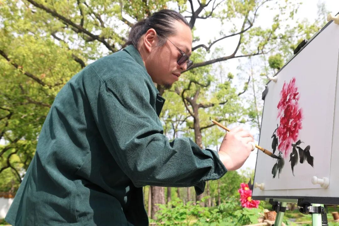 在公园的小径间、绿地草坪上、亭间廊下,居民放慢脚步,静静欣赏牡丹的雍容姿态,抬手定格美景;孩子们睁着好奇的双眼,追着蝴蝶轻声欢笑;老人们或练着太极,或吹奏乐器,或静坐于池边,在自然美景中尽享闲适;摄影爱好者们找准角度,用心记录那灵动瞬间……徐汇区书画协会副会长余英皓创作了《谷雨 蝶恋牡丹》,引来不少居民的围观,“这个蝴蝶画得栩栩如生,真的好看。”“这个就是国粹,牡丹看着就雍容华贵的。”