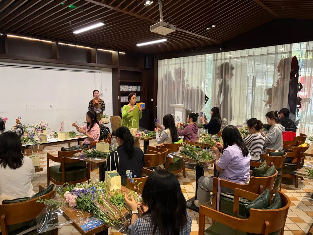 在轻松的氛围里,原本陌生的学员们开始主动交流。有人分享插花心得,有人聊起工作压力,笑声和花香交织在一起。这堂夜校课,既是一次美育的普及,也是一次情绪的“慢充”。