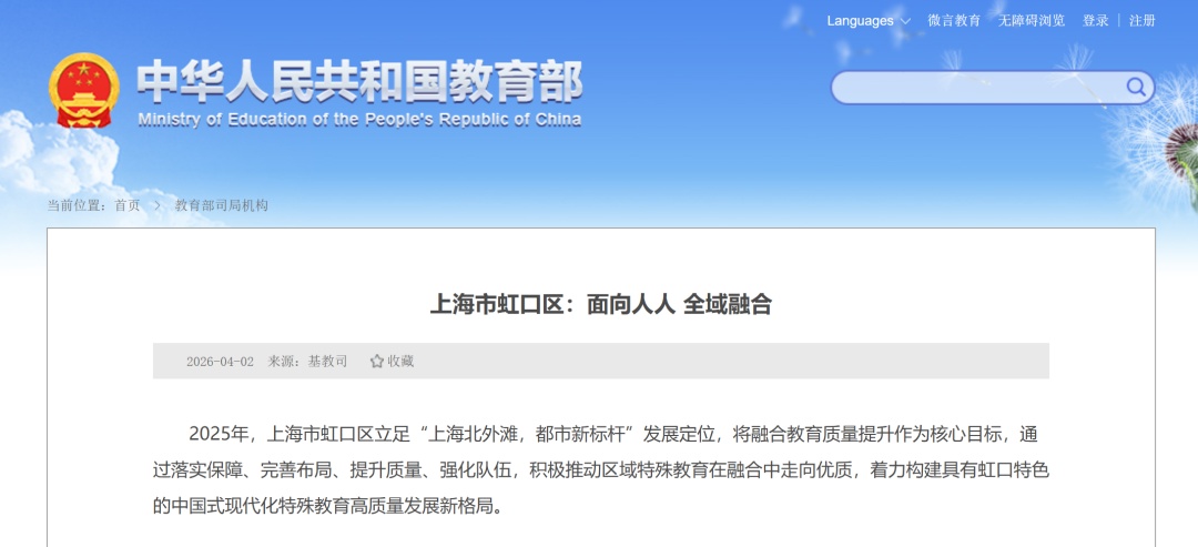 近日,教育部官网刊发《上海市虹口区:面向人人 全域融合》一文,聚焦推介虹口融合教育工作。从全学段覆盖到全域化推进,从暖心服务到专业支撑,虹口始终用包容与匠心,让每一个孩子都能在阳光下平等成长。