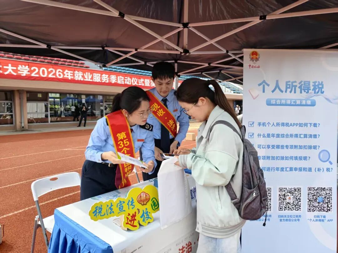 松江区税务局走进工程技术大学2026年实习就业专场招聘会,向即将毕业求职的大学生普及个人所得税、讲解专项附加扣除政策,辅导用人单位合规申报,向参与招聘会的纳税人发放税宣材料,手把手辅导纳税人下载个人所得税App,填报专项附加扣除。