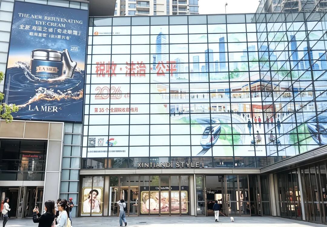 黄浦区税务局在新天地时尚购物中心户外大屏投放税收宣传月主题海报,依托核心商圈人流优势,直观展示诚信纳税理念,让税宣融入城市地标,营造依法纳税、共治共享的良好氛围。