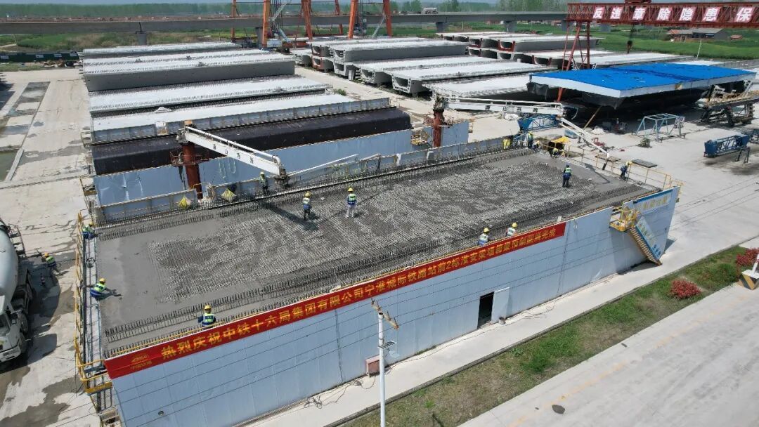 淮安二号制梁场由中铁十六局承建,占地240余亩,场内设置制梁台座13个、存梁台座78个、钢筋绑扎胎具5个、喂梁台座3个,最大存梁能力达149榀。“我们是宁淮城际铁路全线占地面积最大、唯一拥有新型40米高铁箱梁预制能力的制梁场,共承担40米箱梁301榀、32米箱梁587榀、24米箱梁39榀的预制和架设任务,箱梁架设最大运距达25公里,施工体量大、技术要求高。”中铁十六局宁淮城际淮安二号制梁场负责人马胜辉说。