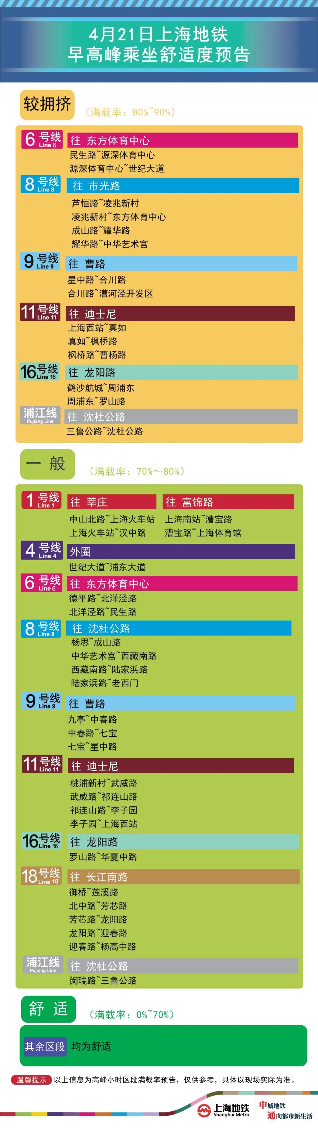 为提升上海地铁早高峰期间出行服务水平,提升乘客乘坐体验,上海地铁向乘客提供乘坐舒适度预告,方便乘客提