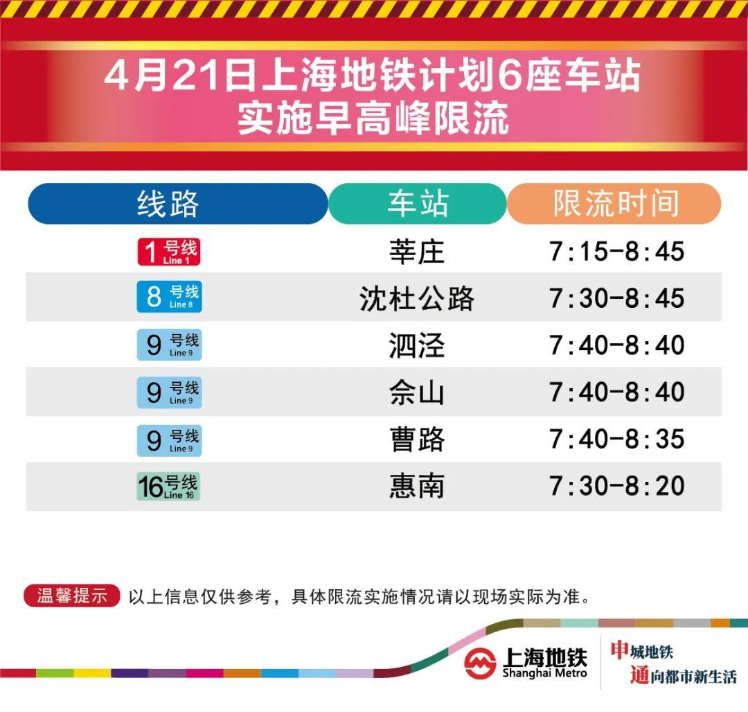 4月21日早高峰泗泾、佘山等6座地铁站计划限流