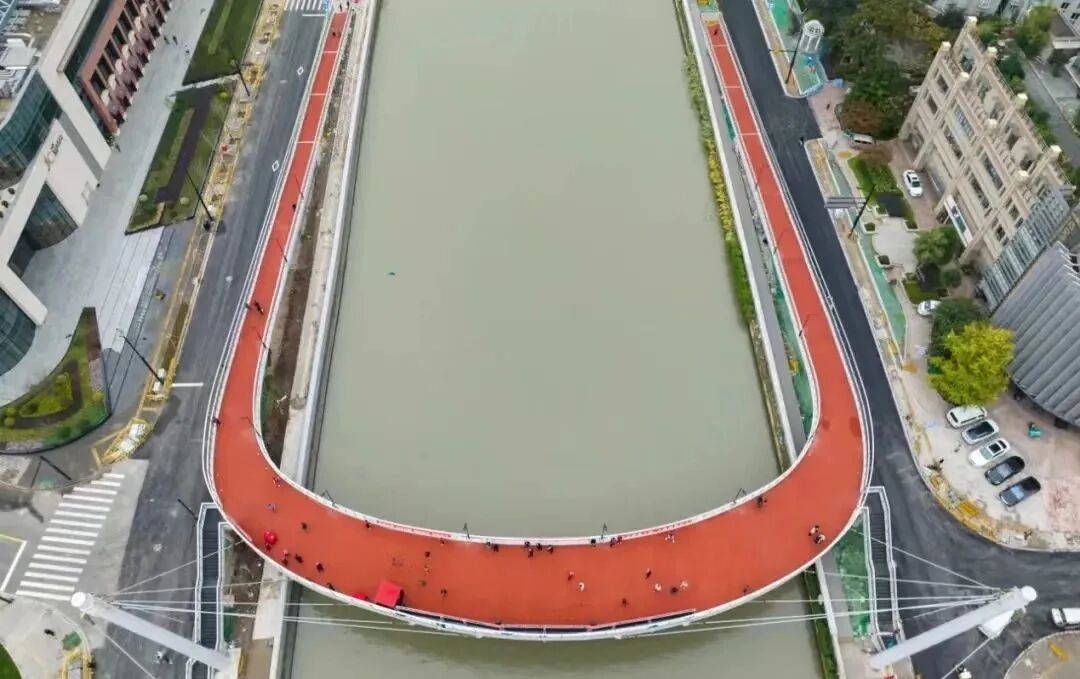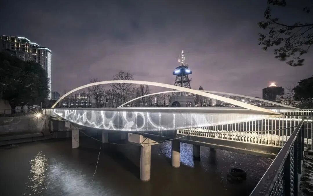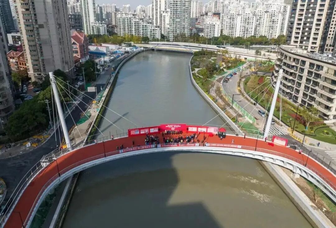 C型桥身漂浮于苏州河上方,成为连接两岸的关键纽带,方便步行、非机动推行、无障碍等不同需求的人群使用,为市民提供公共活动空间的同时,也为苏州河又增加一处近可观、远可赏的景观桥和打卡地。