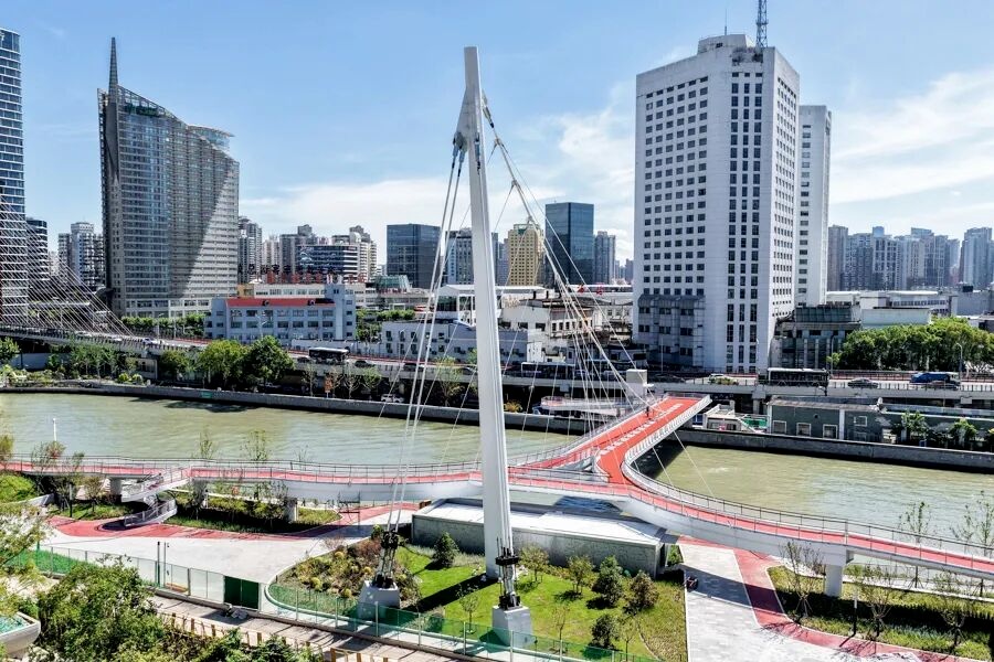 苏州河上首座独塔悬索桥——百合桥已于2025年9月开放通行。从空中俯瞰,百合桥呈“人”字形布局,桥梁主体和桥下的绿化景观布置又形成了一个“合”字。