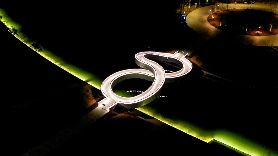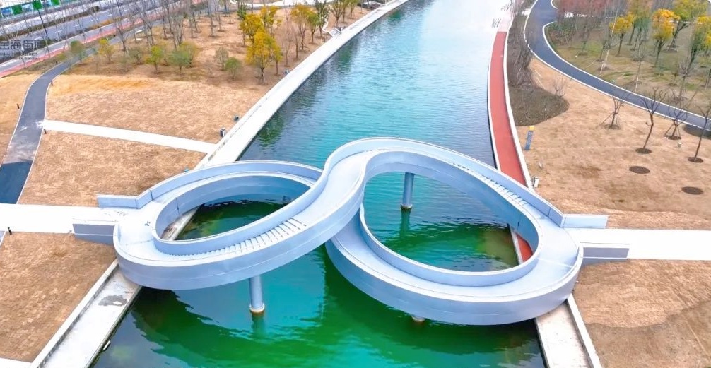 在奉贤的上海之鱼,有一座高颜值的“8”字形人行桥。这座桥分上下两层,上下皆可通行。上下层桥端部设置两个平台相互连接,整体形成一个闭环模式。从空中俯瞰为一个完整的“8”字形状。