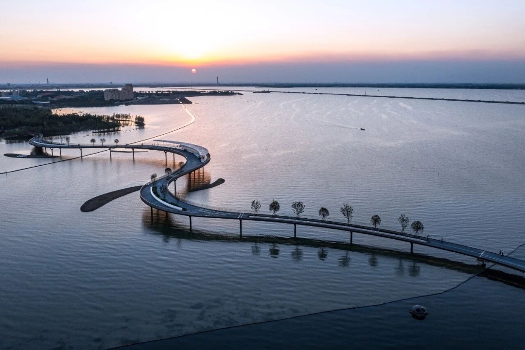 元荡桥作为长三角生态绿色一体化发展示范区首座新建慢行桥,不仅打通上海青浦与江苏吴江的地域阻隔,更以独特自然风貌融入淀山湖生态区其造型宛如“缎带”飞卧在元荡湖上。听着微波拍打岸边发出的轻柔水声,看着远处开阔的元荡湖,不禁让人心旷神怡。