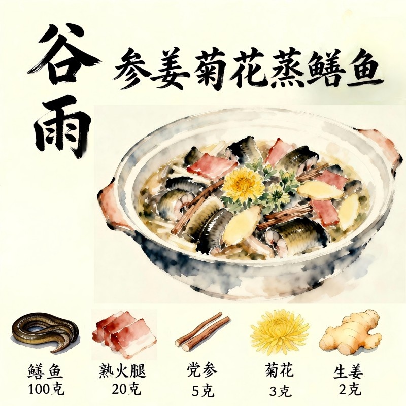 今天让我们试试这份谷雨药膳美食——参姜菊花蒸鳝鱼