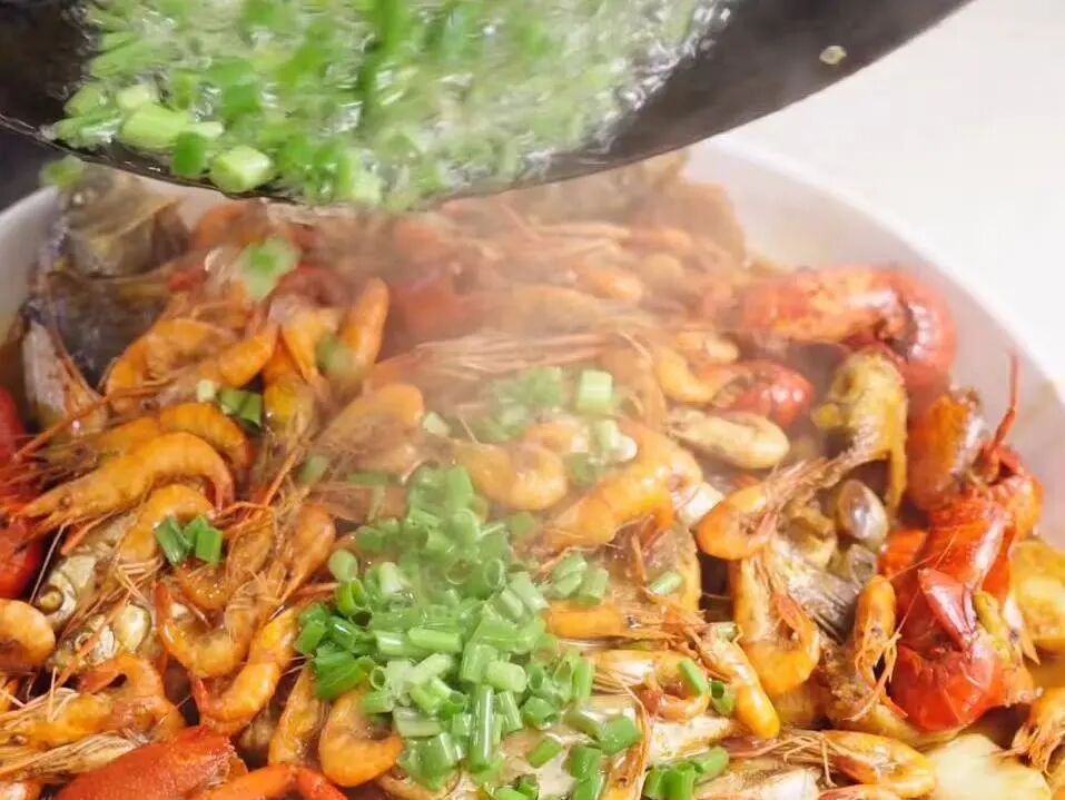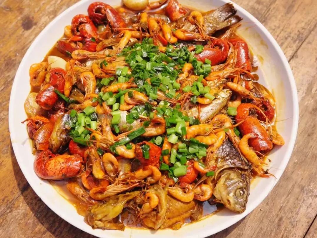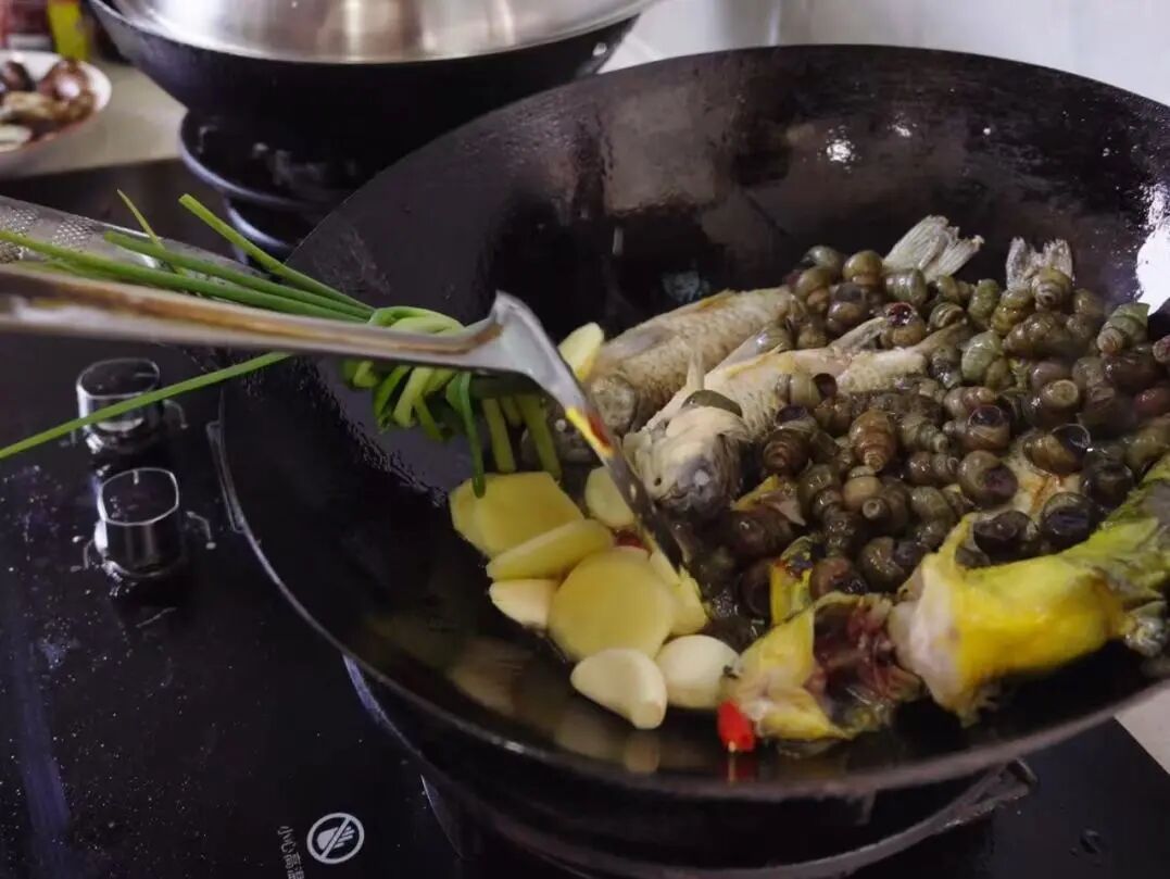收拾停当,便可起油锅。烧到微微冒烟,姜片、干辣椒先下去爆香,再把鱼虾一起倒进去,煎到两面金黄、表皮微皱。杨叔叔的儿子说,火候是关键——煎得太嫩腥气重,煎得太老肉质柴。接着淋入料酒、酱油,撒糖和盐,添一瓢清水,螺蛳最后才下锅。盖上盖子,小火焖煮几分钟,等到汤汁收浓,撒一把碧绿的葱花,整锅端上桌。