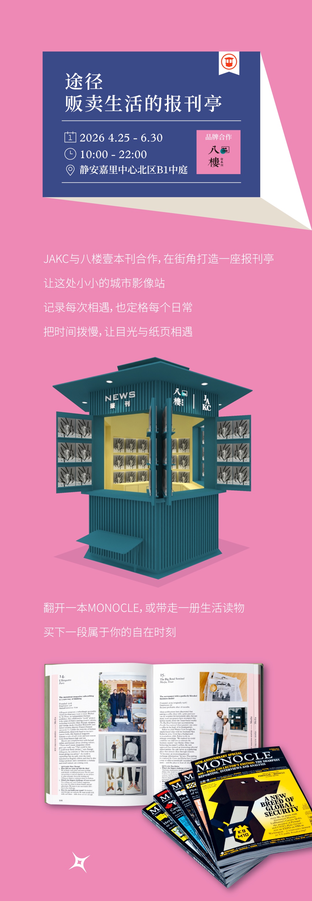 翻开全球生活方式的殿堂级顶刊,从伦敦到上海,从纸质刊页到城市空间,MONOCLE将带我们跳出习惯的视角,以“旁观者”的敏锐与“热爱至上”的真诚,重新观察静安区与JAKC的独特魅力。