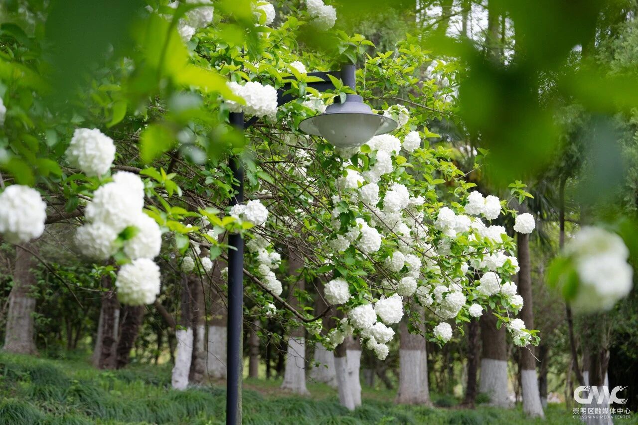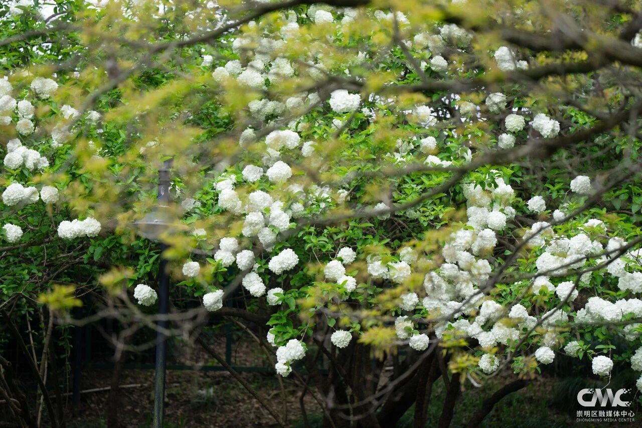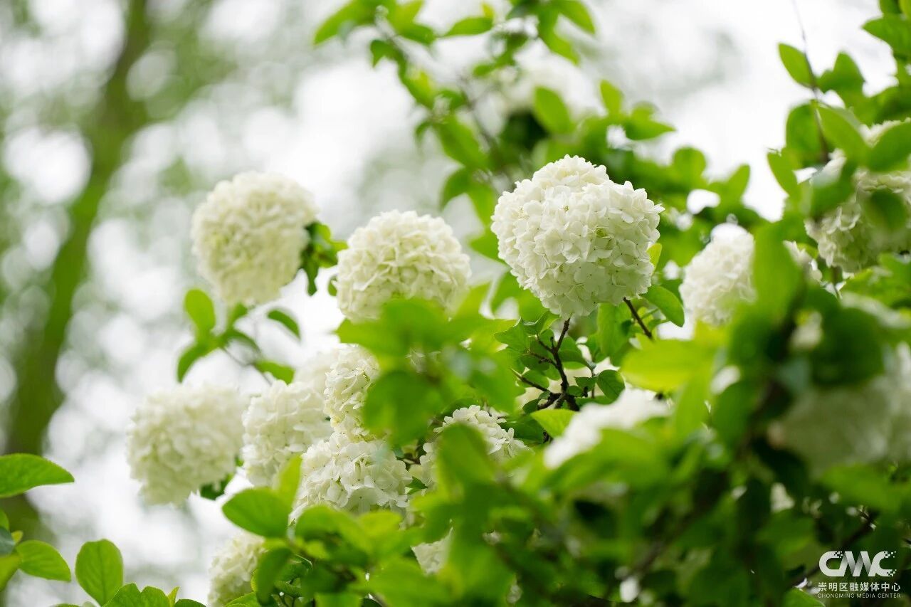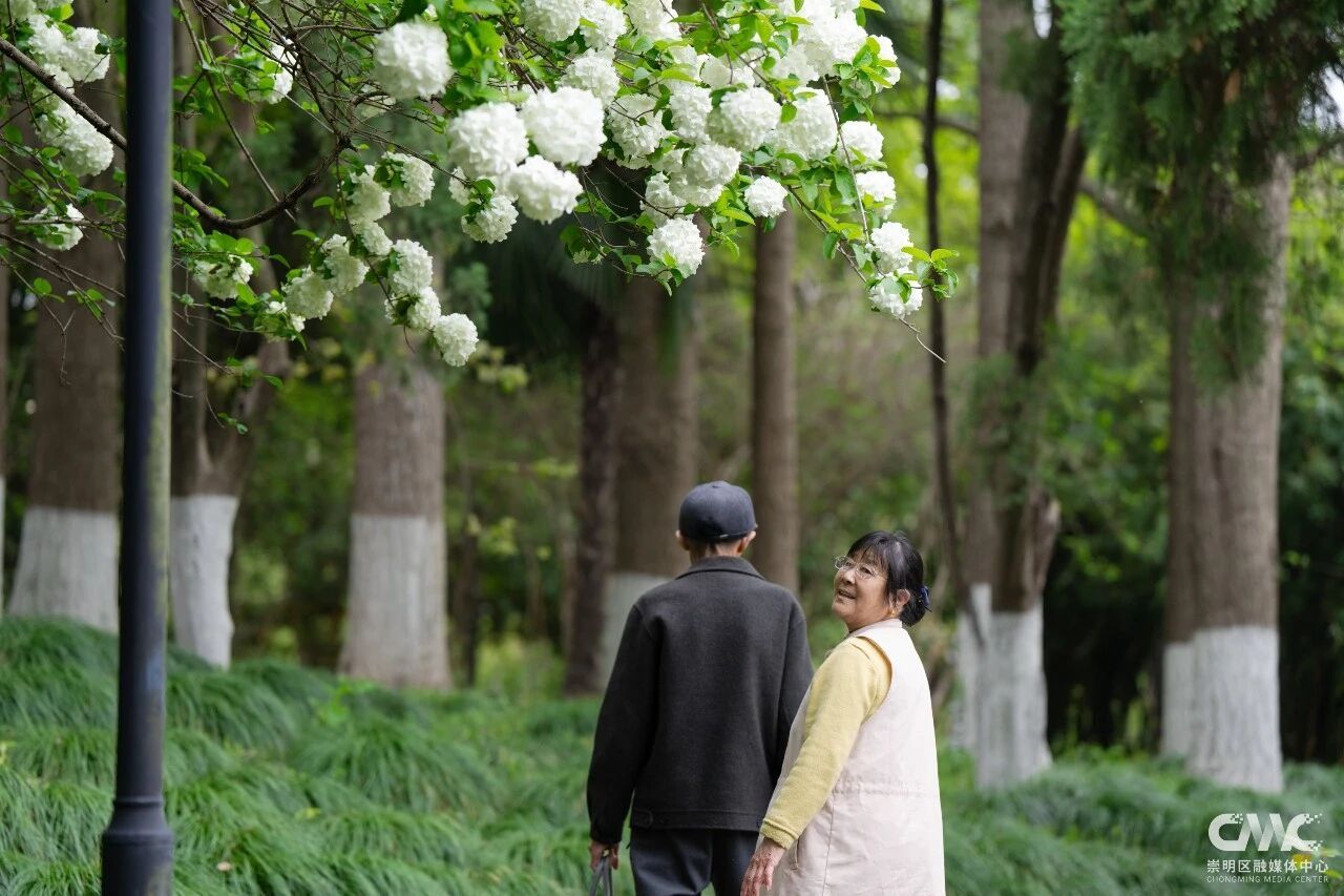 瀛洲公园里藏着19棵木绣球,其中一棵树龄40年的老树,花球比普通的大一圈,是当之无愧的 “赏花C位”