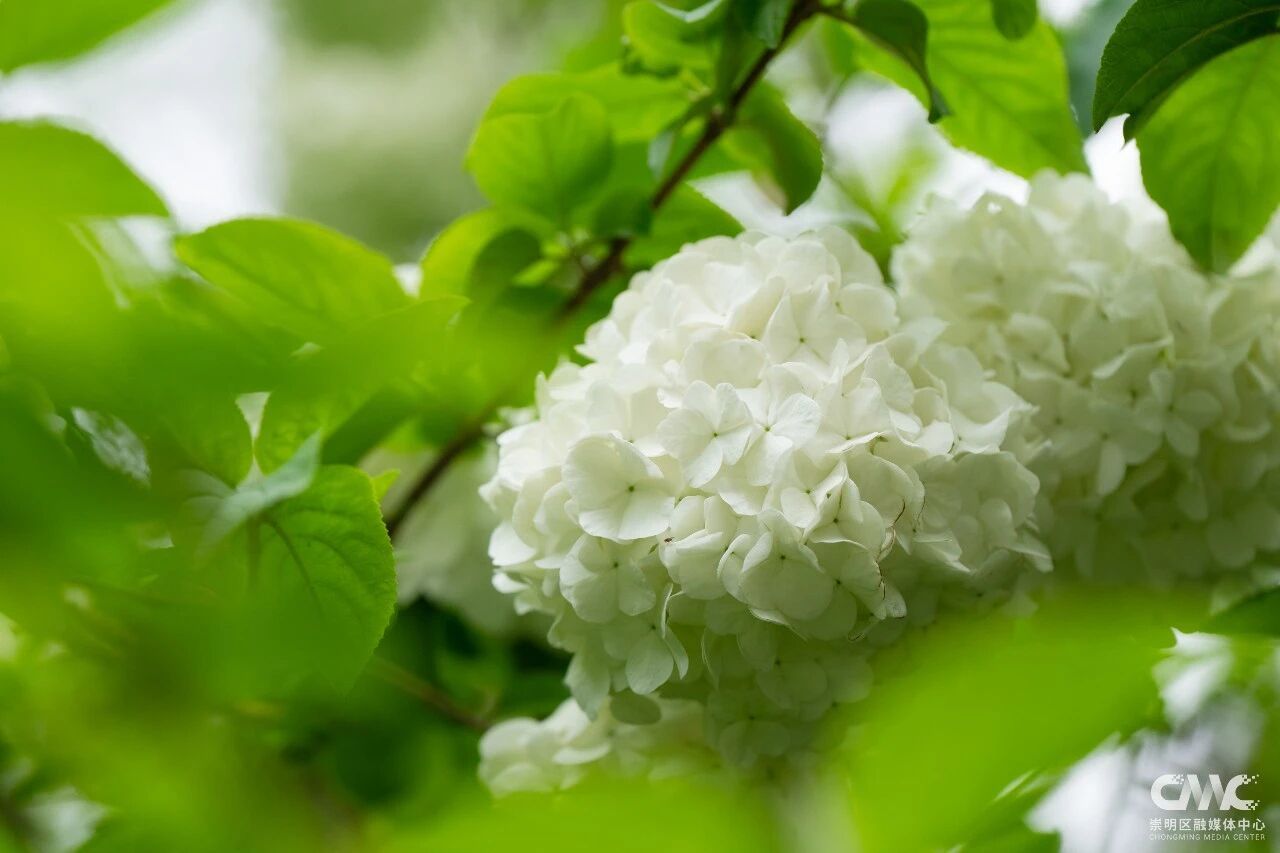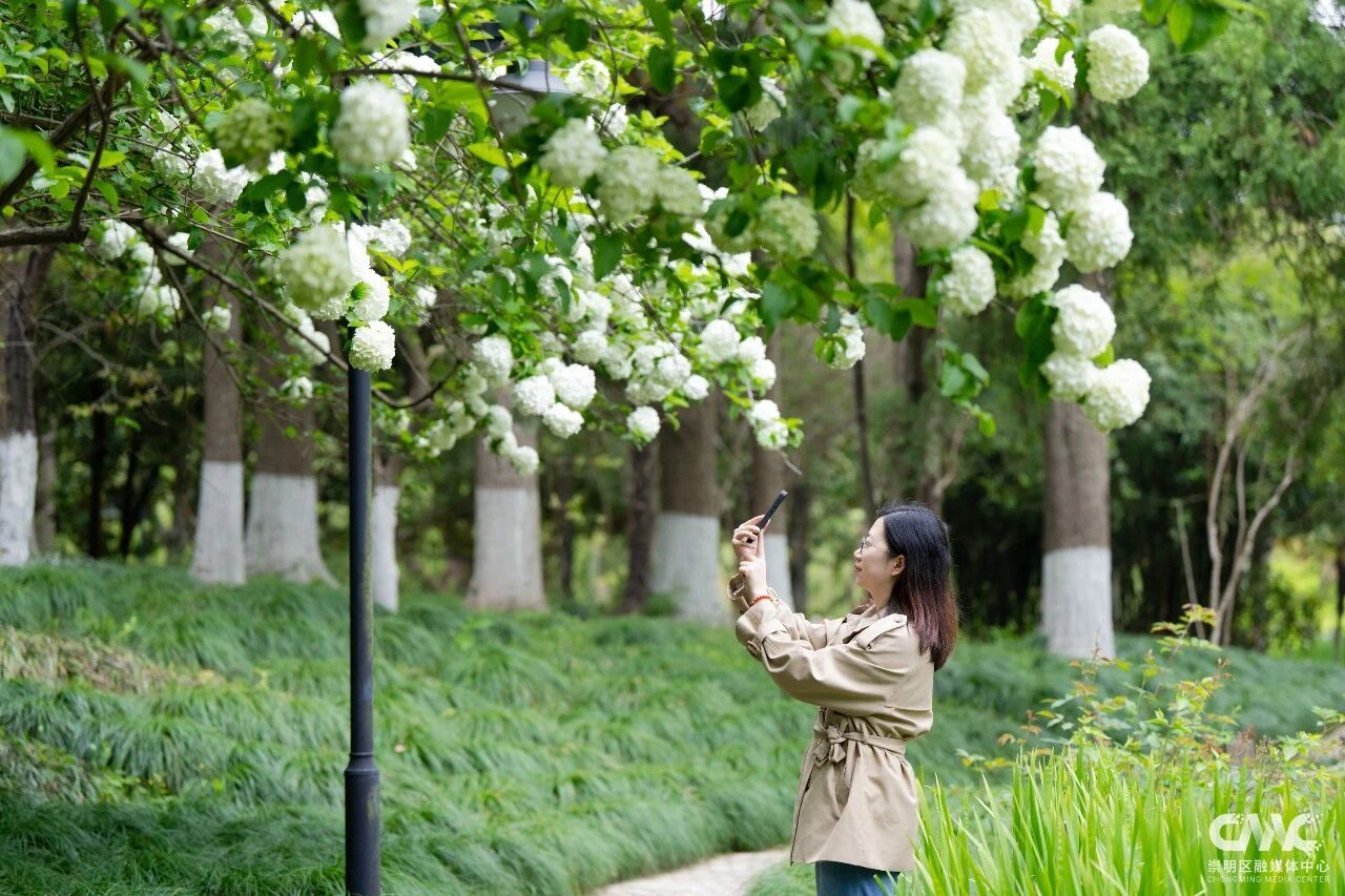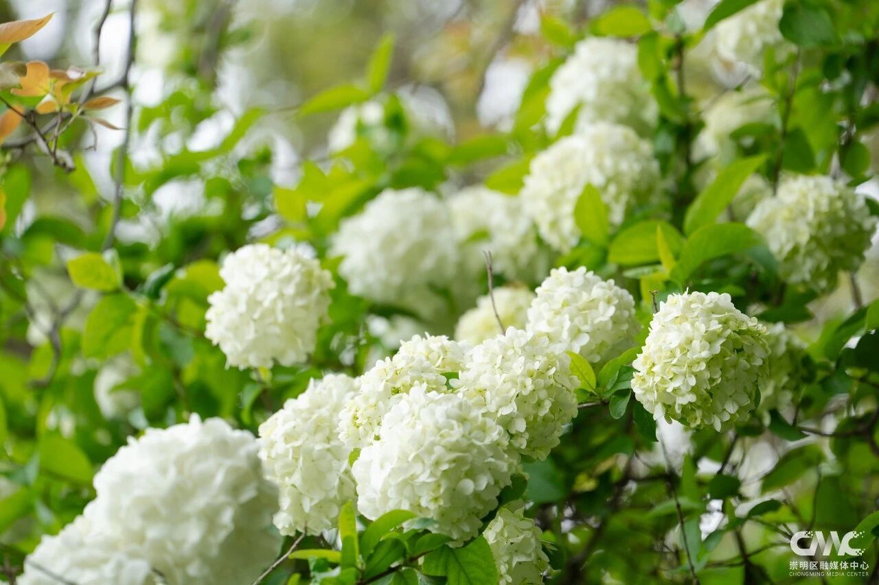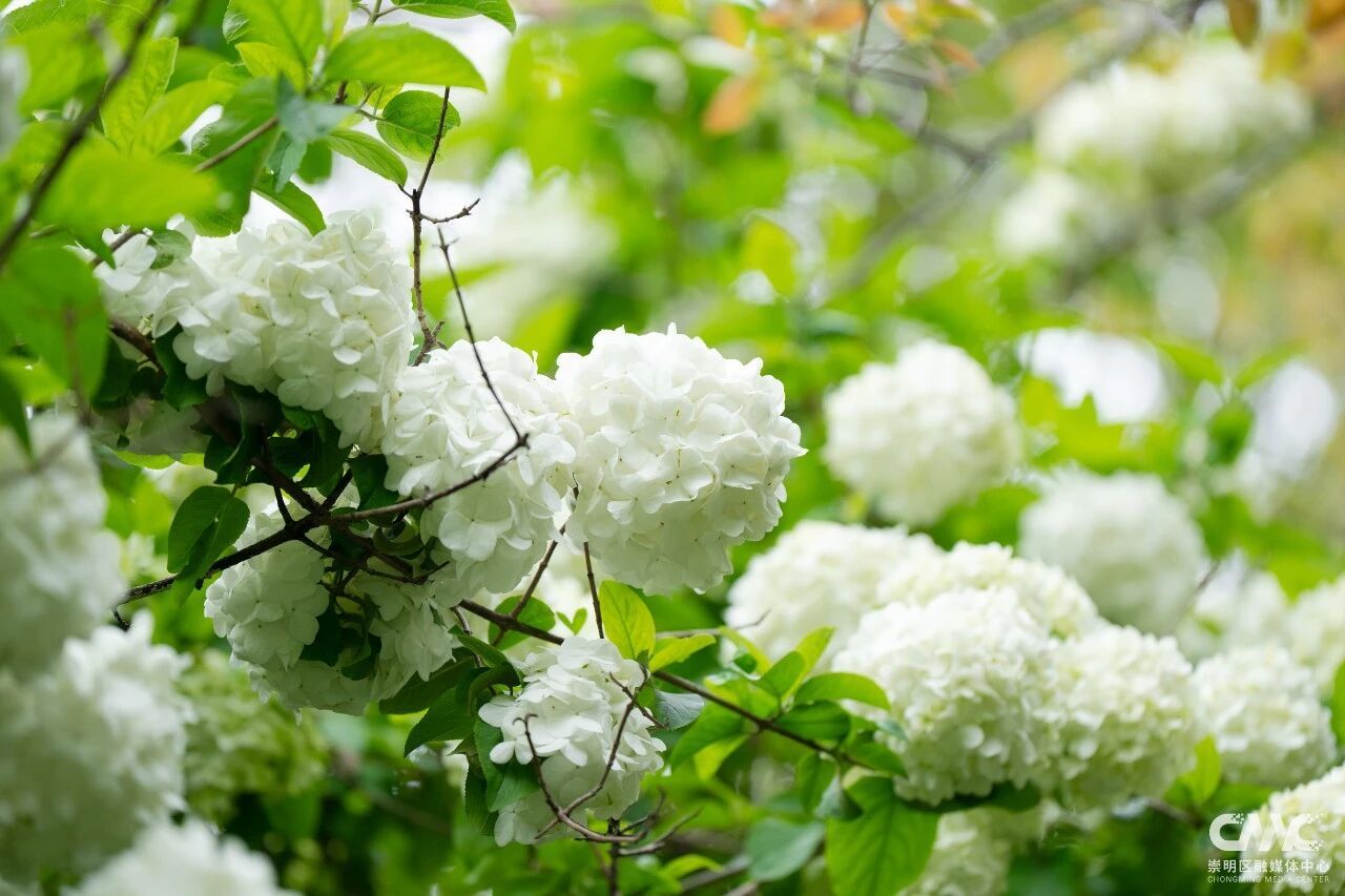 瀛洲公园里藏着19棵木绣球,其中一棵树龄40年的老树,花球比普通的大一圈,是当之无愧的 “赏花C位”