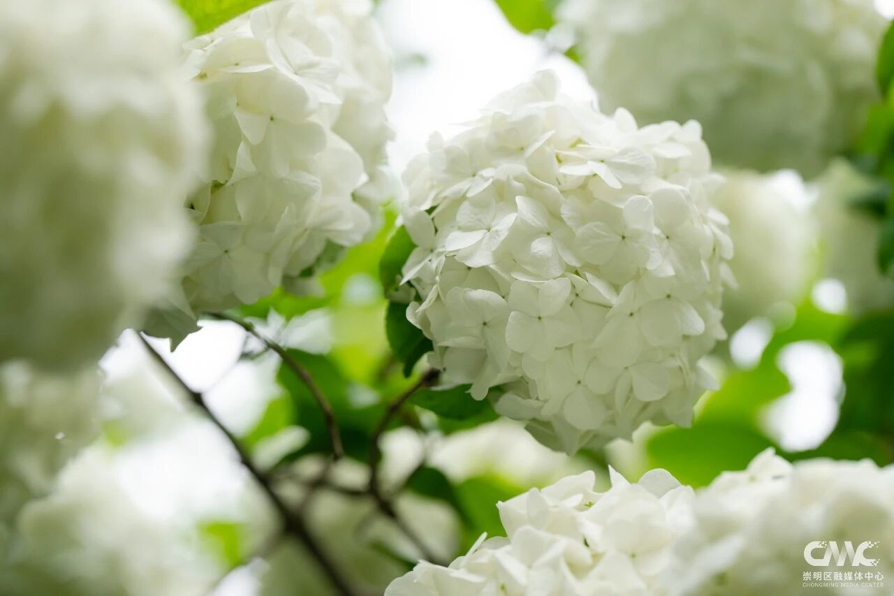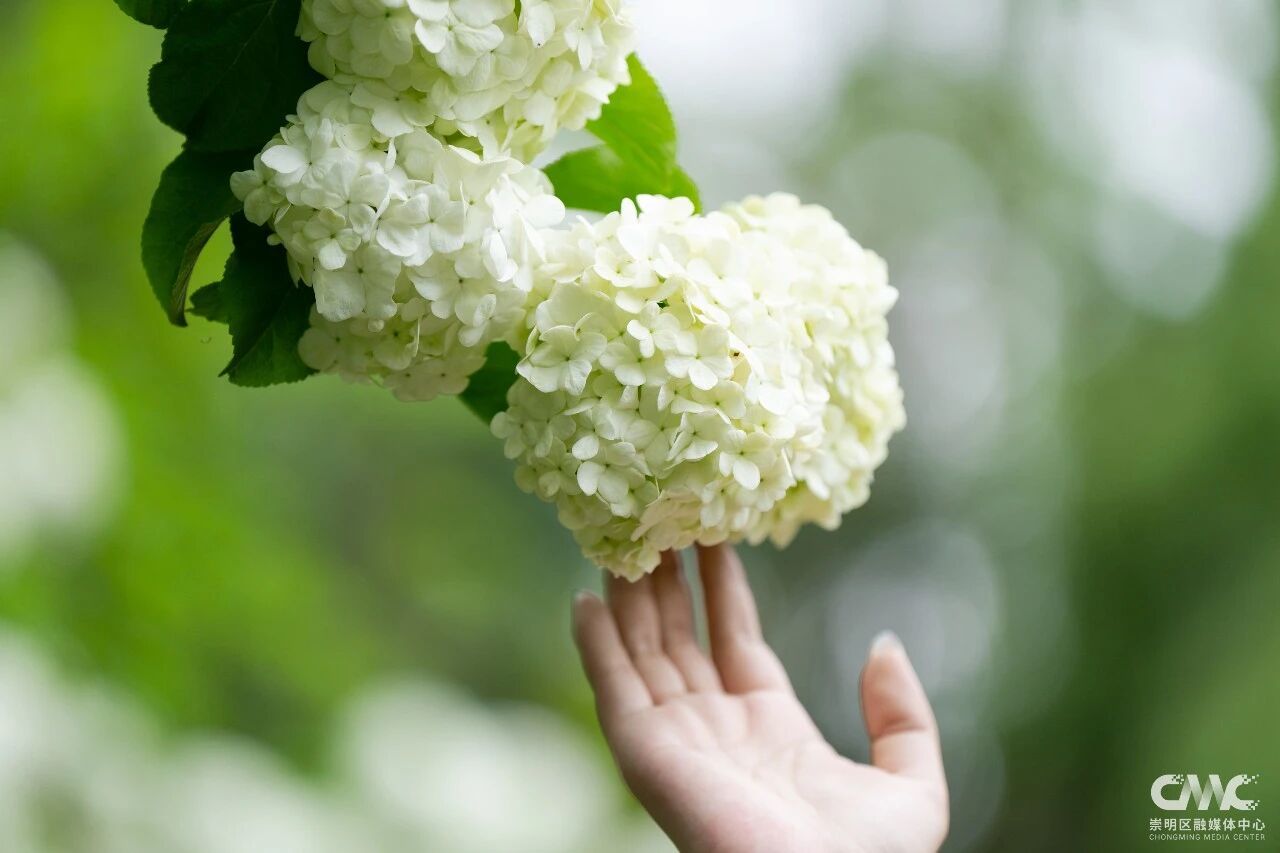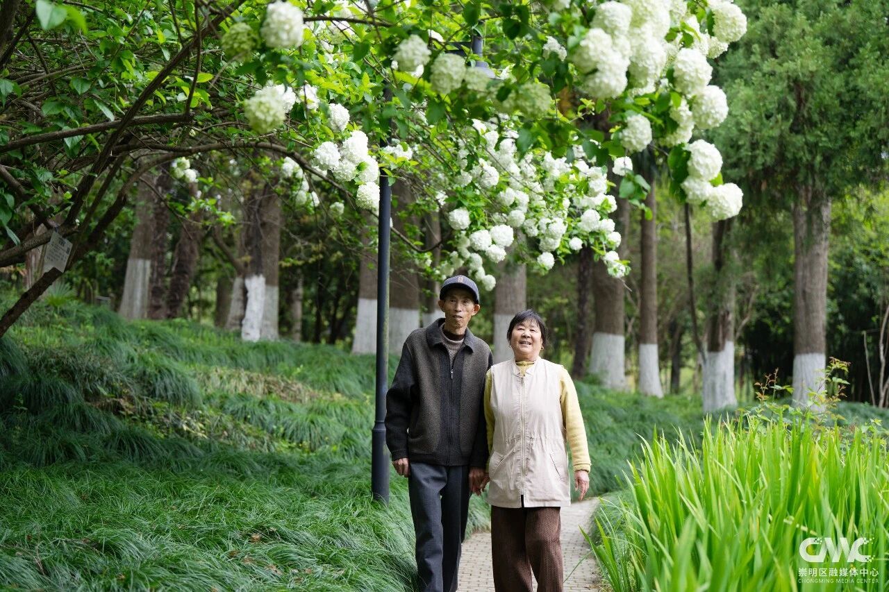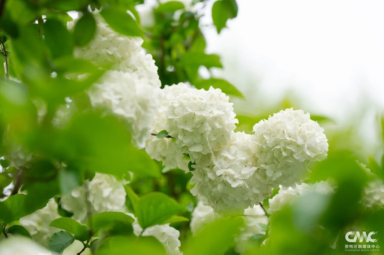 瀛洲公园里藏着19棵木绣球,其中一棵树龄40年的老树,花球比普通的大一圈,是当之无愧的 “赏花C位”