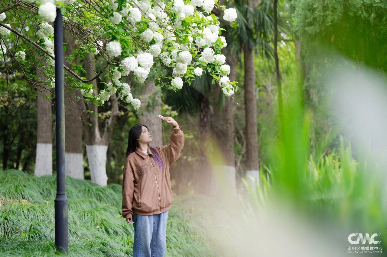 早上或傍晚光线最柔,穿浅色衣服,和白色花球绝配,湖边、林间都有,边走边拍。