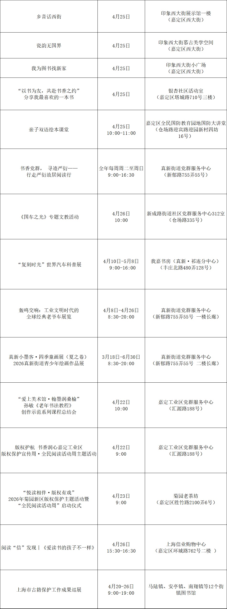 4月25日,嘉定镇街道将在西大街举办“阅动疁城·创艺新生”主题活动。活动以西大街先行启动区为载体,打造沉浸式阅读、文化沙龙、精品书单分享、城市阅读路线发布等多元体验,让书香与老街文脉相融;会场外同步开设童声沪语讲解、版权公益讲堂等特色环节,以阅读赋能城市更新,让文化可感可触。