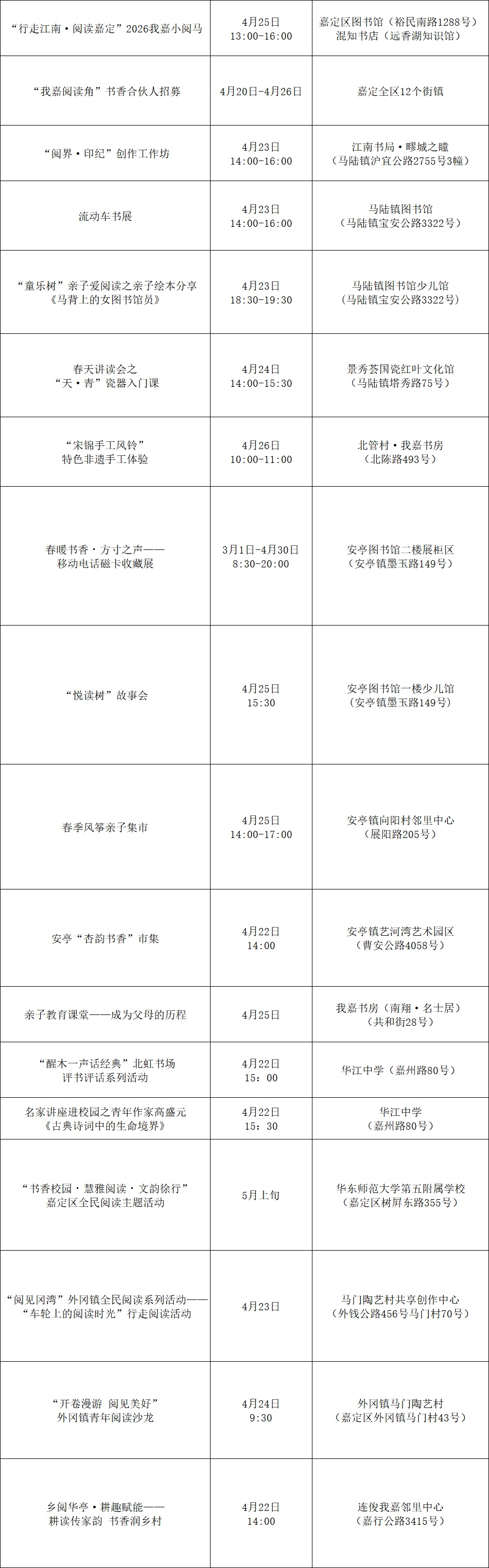 与此同时,远香湖畔的“行走江南·阅读嘉定”2026我嘉小阅马活动将于4月25日开赛。活动邀请市民读者共读一本主题图书,在远香阅读环设置阅读会场,通过限时(3小时)阅读与答题挑战等形式,激发参与者的阅读潜能与创造力。
