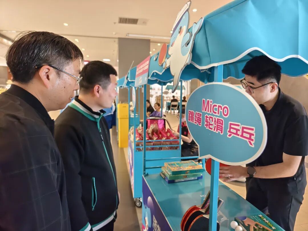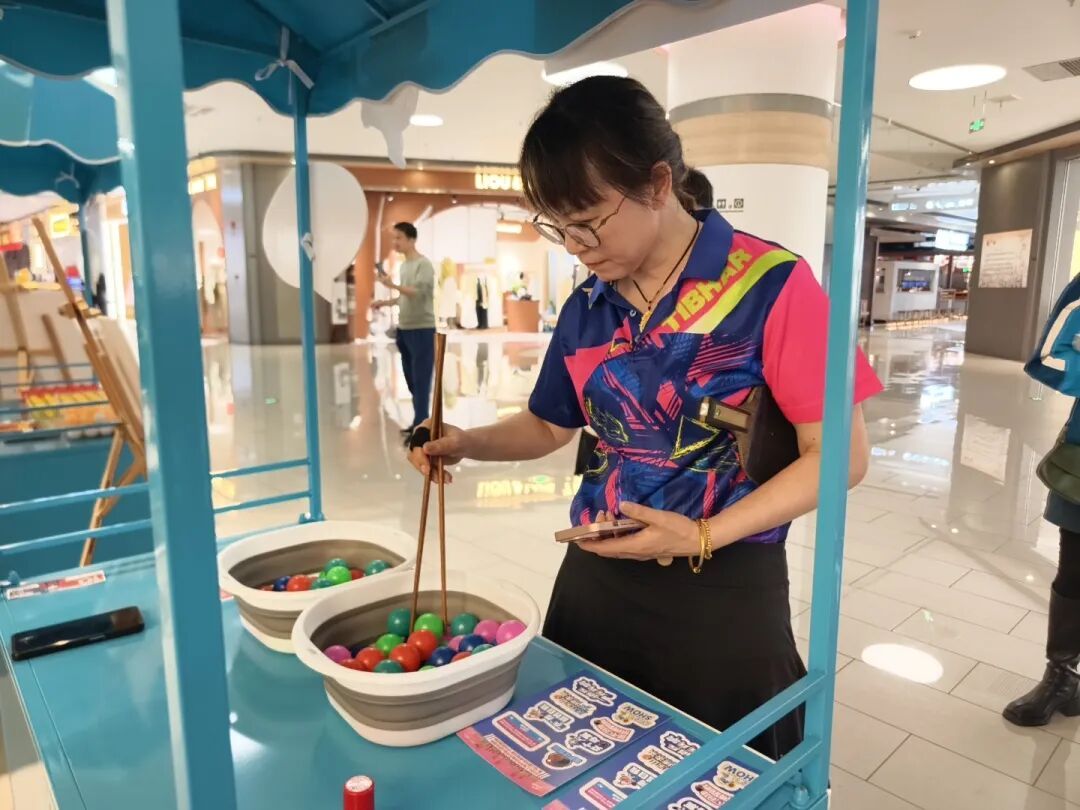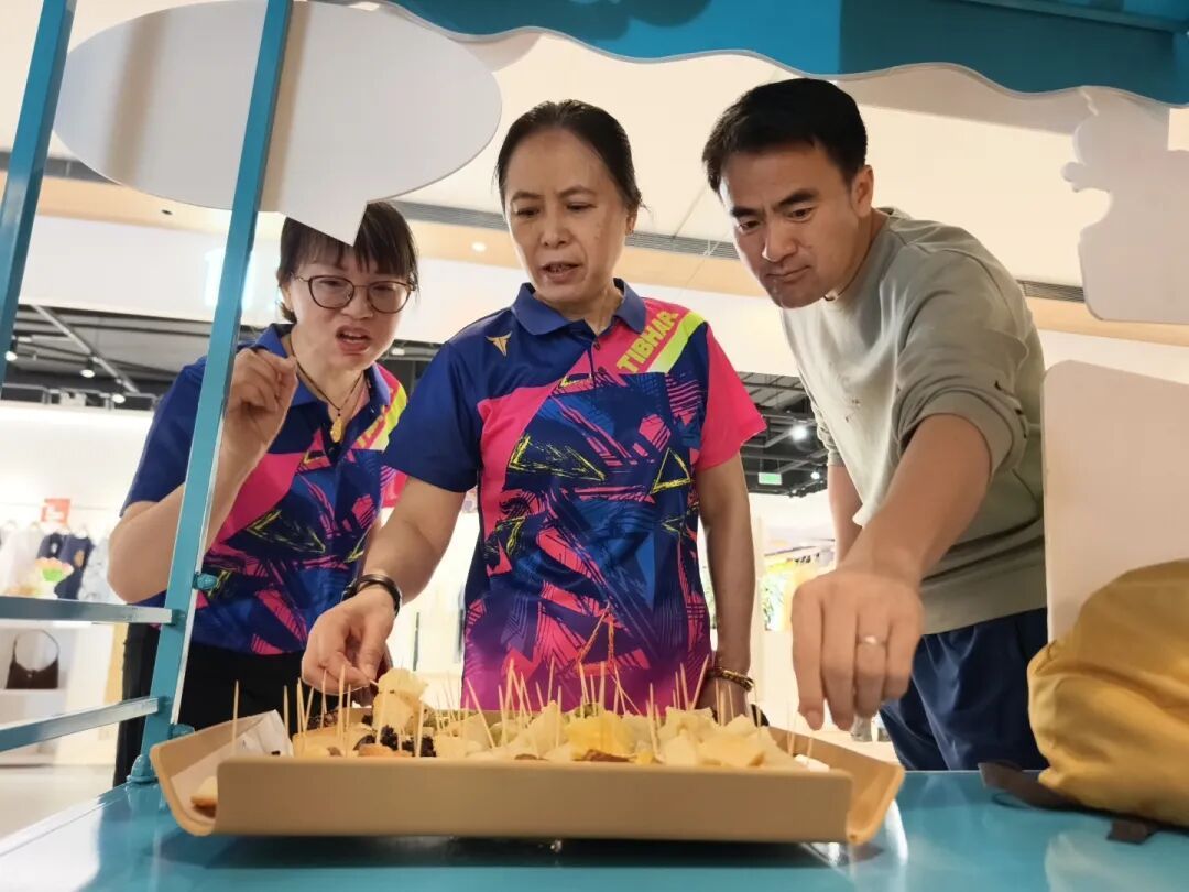 在赛场同楼层的另一侧,乒乓球嘉年华的活动区也是热闹非凡。这里摆下了一个又一个摊位,为参赛球员和球迷提供各种温馨的服务和互动。有的球员来这里品尝小点心补充体能,有的玩起了长筷子夹乒乓球的游戏,有的用手抓起一个个乒乓球,朝两三米远的纸杯里投掷,有的被各种乒乓球题材小挂件、工艺品所吸引,有的则专注于这里的球拍等球员装备。宝山日月光还在这里提供了舒适的小桌和椅子,为球员临时休息创造条件,赛事的氛围、温馨的服务,切实增强了大家的获得感。