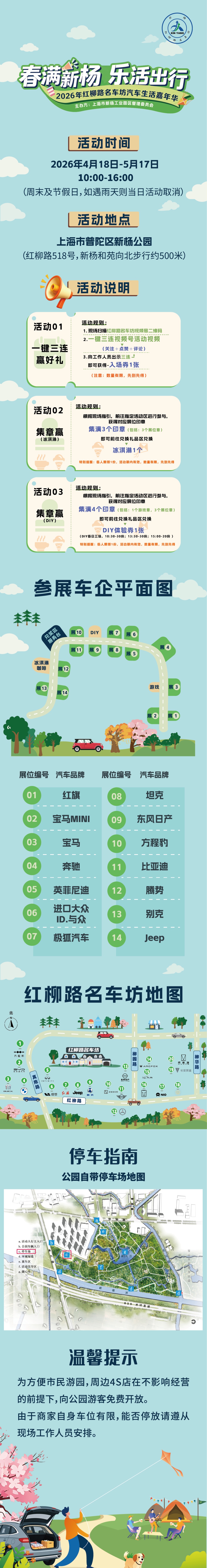 在刚刚过去的周末,新杨公园(红柳路518号)内人头攒动、笑语盈盈,“春满新杨 乐活出行”2026年红柳路名车坊汽车生活嘉年华在这里欢乐启幕。作为普陀新杨工业园区重点培育的汽车消费地标,红柳路名车坊此次联动14家入驻及合作汽车品牌,将名车展示、亲子游乐与春日游园巧妙融合,打造出一个可逛、可玩、可沉浸体验的“车生活”生态圈。据统计,仅开幕周末两日就吸引超万名市民游客前来打卡,各品牌累计收获有效留资超百组,实现人气与口碑双丰收。 步入新杨公园的活动区域内,红旗、宝马、奔驰、比亚迪等14个精选汽车品牌展位沿步道错落铺开。从高端新能源到经典燃油车型,从硬派越野到时尚家轿,涵盖都市消费者的不同需求。市民们或驻足细赏车身设计,或坐进驾驶舱零距离感受智能座舱的魅力,不少家庭更是扶老携幼一同“逛车展”。品牌销售顾问现场细致讲解,许多游客当场预约试驾、留下购车意向。“我们希望通过这种将看车融入游园的形式,让选车过程变得轻松惬意。消费者无需专程奔赴4S店,在踏青赏花的闲暇时光,便能零距离接触心仪座驾。”新杨工业园区相关负责人表示。 除了专业的汽车展示,嘉年华更把“生活”的温度贯穿始终。活动现场设置游戏互动区,丢沙包等摊位前始终排着长队,欢笑声此起彼伏。人气最旺的当属“集章打卡免费领冰淇淋”环节,游客边逛展边收集各品牌印章,集齐即可兑换清凉冰淇淋一份。有车可看、有美食可尝、有亲子项目可玩,活动全程免费开放,让不少市民解锁了春日新体验。家住桃浦的丁奕雷原本只是带着家人出门踏青,却意外被嘉年华吸引,“来了才知道家门口还有这样一场活动。男士们感兴趣的汽车,孩子们喜欢的游戏,一家都可以在这找到各自的乐趣,五一期间考虑再来!” 作为新杨工业园区重点打造的特色项目,红柳路名车坊自亮相以来便持续探索“汽车+生活”的多元表达形式。本次嘉年华将高端汽车品牌从展厅延伸至开放式公园空间,打破传统看车场景的空间壁垒,让汽车从单纯的“出行商品”,回归为承载“品质生活方式”的载体。这一创新举措,既降低了消费者的看车门槛,又为周边居民提供了高品质的周末休闲选择。 本次汽车生活嘉年华将持续至5月17日,覆盖期间所有周末及节假日(如遇雨天,当日活动取消)。有购车意向的消费者还可前往临近的红柳路名车坊解锁更多座驾展示,开启属于你的品质车生活。