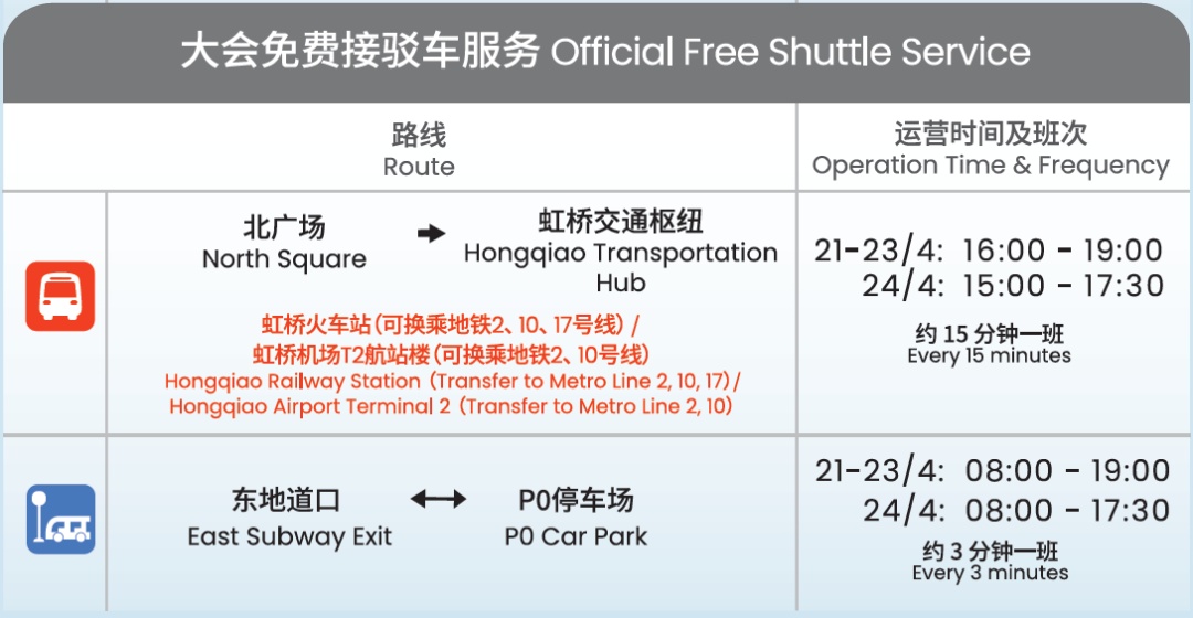 懒得走?您也可乘坐展馆东侧地道口的免费接驳班车。班车可接驳至P0停车场及龙湖虹桥天街。