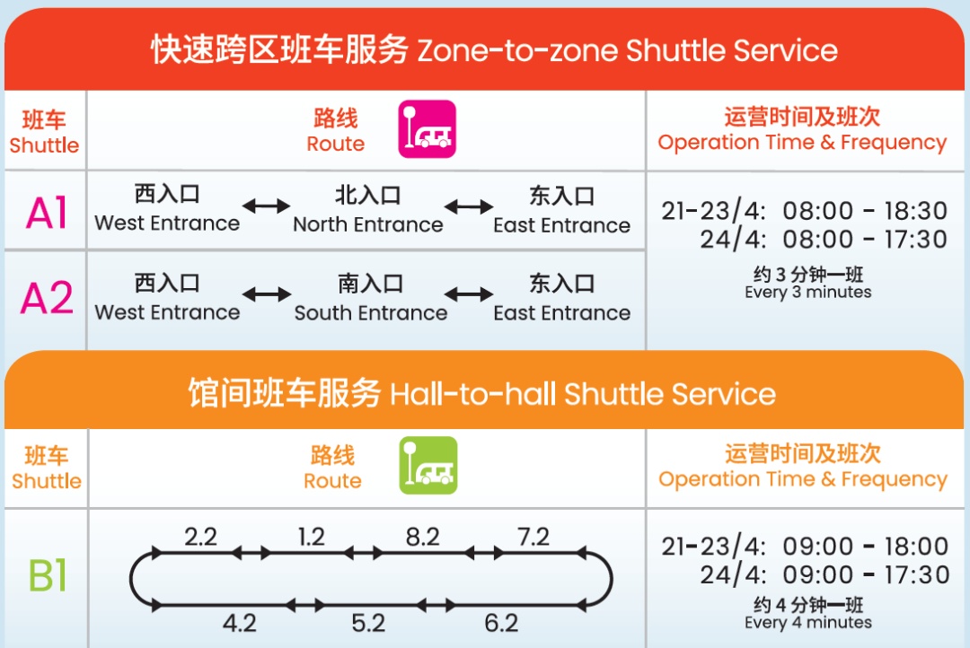 届时主办方将在西入口、北入口、东入口及南入口附近,设置相关班车服务指引,请大家现场留意。