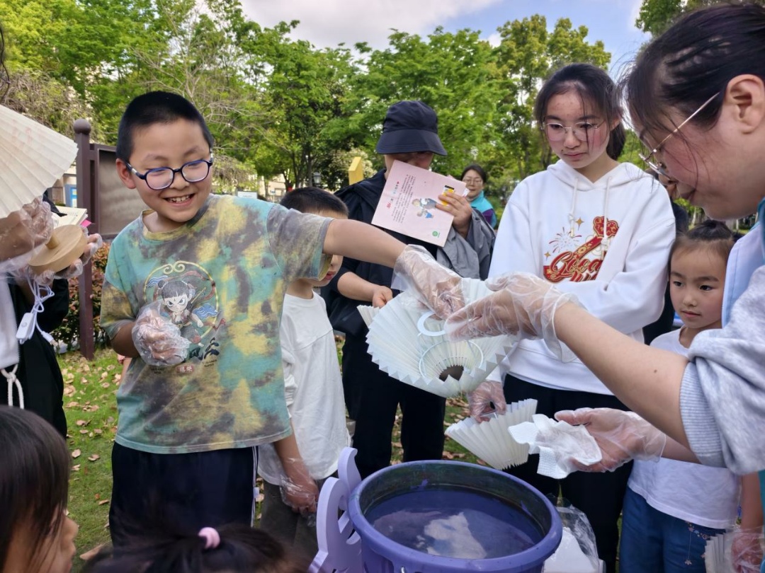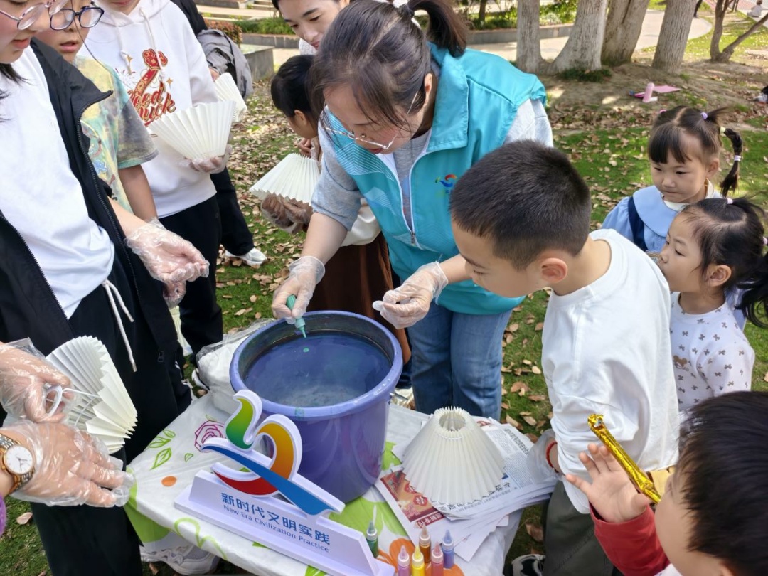 紧接着的漂漆台灯手工环节,让孩子们由静转动、从聆听思考到创意创作,尽情释放童趣与灵感。孩子们在清水里调和颜料,让色彩自然晕染,轻轻转动灯罩,便绘就独一无二的春日图案。“小朋友们,每个灯罩都是属于你们独一无二的一款喔。”孩子们满怀期待且小心翼翼地制造出一盏盏斑斓又满载着创意的台灯。“太漂亮啦!晚上我就要在台灯下面,读今天和小朋友交换的阅读本!”。