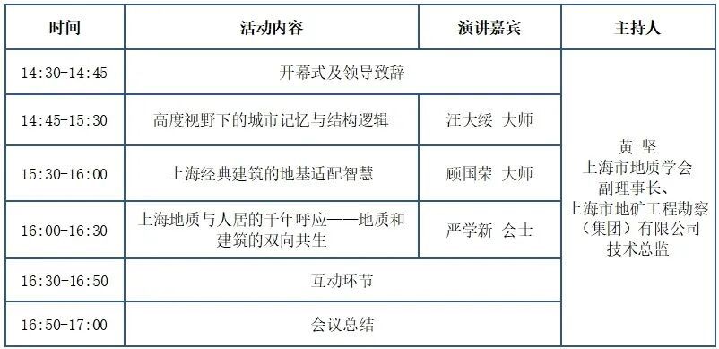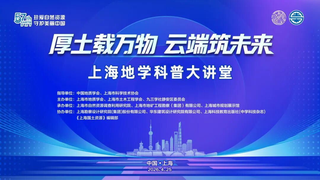 今年4月22日是第57个世界地球日,自然资源部以“珍爱自然资源 守护美丽中国”为主题,引导全社会参与自然保护和生态修复,推进人与自然和谐共生的现代化建设。为纪念第57个世界地球日,上海市地质学会、上海市土木工程学会、九三学社静安区委员会联合相关单位将于2026年4月25日(周六)下午14:30在上海城市规划展示馆5楼,举办以“厚土载万物,云端筑未来”为主题的上海地学科普大讲堂。本次大讲堂将邀请全国工程勘察设计大师汪大绥、全国工程勘察设计大师顾国荣以及中国地质学会会士严学新等专家学者作主旨演讲,并与观众互动交流。
