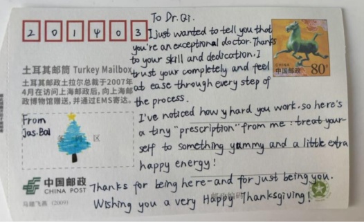 医者的温柔,原是这世间最轻却又最重的行囊。它被装进每一次俯身的倾听里,装进每一句术前的提醒里,装进每一个下班后仍要发出的问候里。然后,它会跨过山海,穿过四季,以一张明信片的方式,悄然归来。