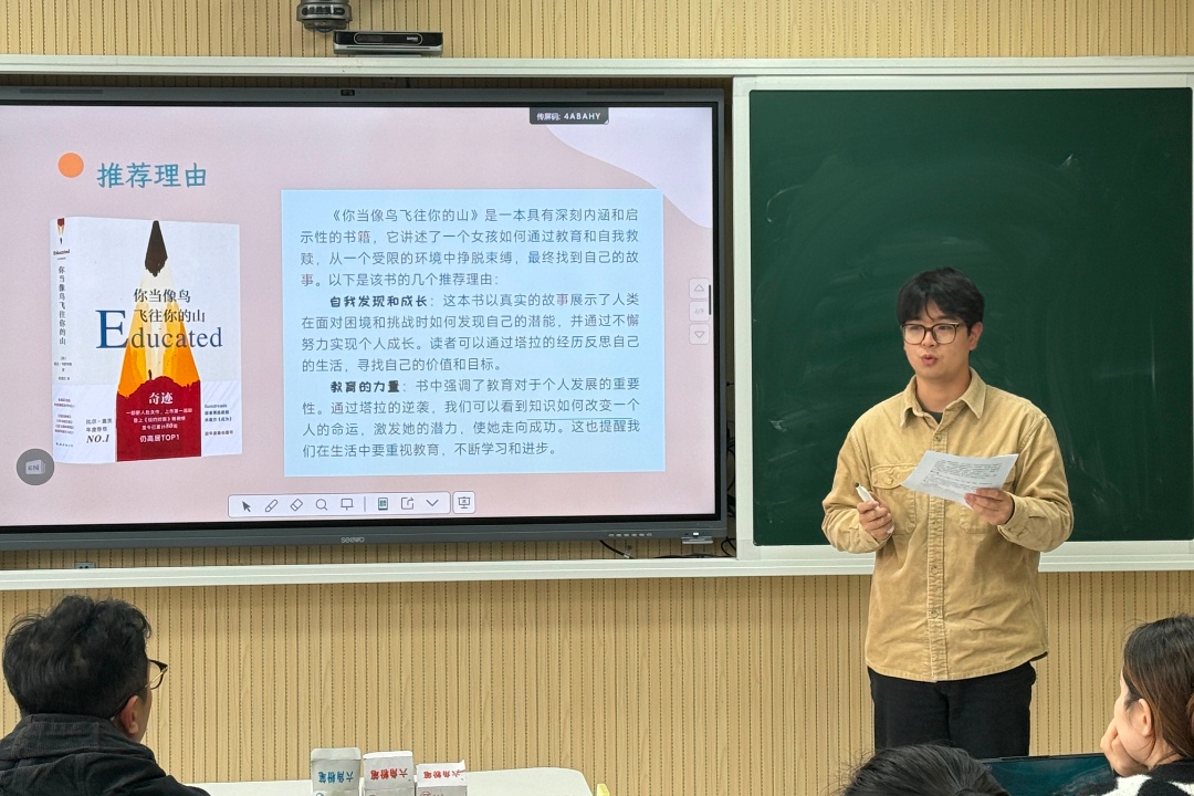 学校推出“One book, one bloom”整本书阅读项目。学生们不仅是读者,更化身“小小荐书官”——他们为喜爱的书画一张荐书卡,设计一枚书籍腰封,在“牡丹诗会”上把读后的诗意写在花瓣旁。文学理解与美术创意在此交融。