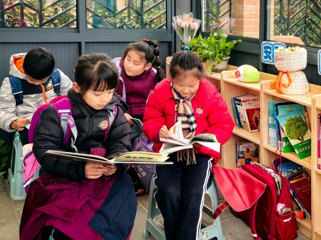 ▲校门口“悦憩港湾”内孩子专注阅读