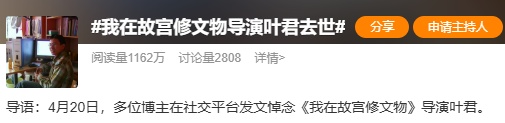 4月20日,清华大学影视传播研究中心发布讣告,悼念《我在故宫修文物》导演叶君。