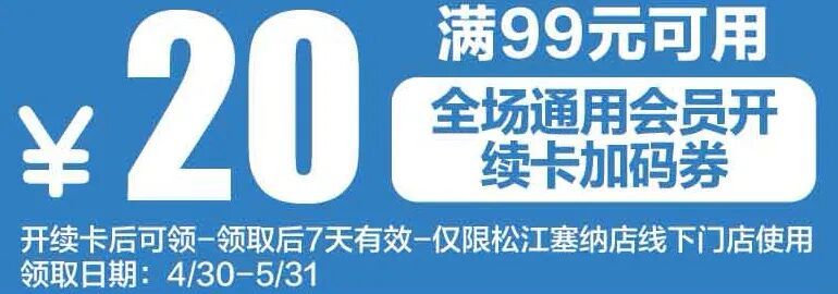 ⭕️开续卡可领满99-20全场通用加码券,开续卡后可领,领取后注意7天内到店使用哦!